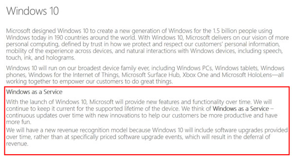 Dans un document Powerpoint présenté aux investisseurs, Microsoft expliquait récemment qu'avec Windows 10, "Microsoft fournira de nouvelles fonctionnalités à travers le temps" et qu'il voit désormais Windows comme "Windows as a Service", avec "des mises à jour continues dans le temps, avec de nouvelles innovations pour aider nos clients à être plus productifs et avoir plus de plaisir". La firme expliquait que ces mises à jour affecteraient la manière d'estimer les revenus générés par les achats de Windows, puisque les mises à jour permettront de générer des revenus en fonction des opportunités commerciales.