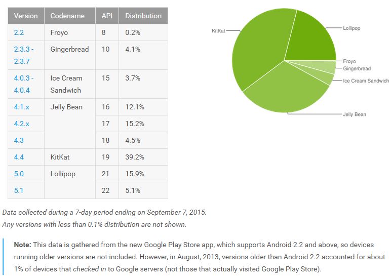 La progression de Lollipop a essentiellement pesé sur Gingerbread, Ice Cream Sandwich et Jelly Bean. Par contre, Froyo et KitKat demeurent très stables : leurs parts de marché varient de façon négligeable, en recul de 0,1 %. Mais ces deux branches n'affichent pas la même santé : Froyo ne figure que sur 0,2 % des terminaux, tandis que KitKat fait encore très largement la course en tête, à 39,2 %.