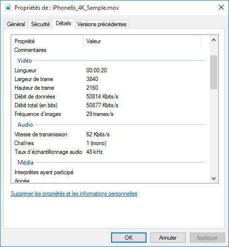 Avec la 4K, la moindre vidéo pèse lourd, très lourd. Sur son site, Apple diffuse un sample de vidéo 4K (.mov) tournée avec l'iPhone 6S, qui pèse 130 Mo pour 20 secondes, soit 6,5 Mo la seconde, avec une bande son mono de 62 Kbps seulement :