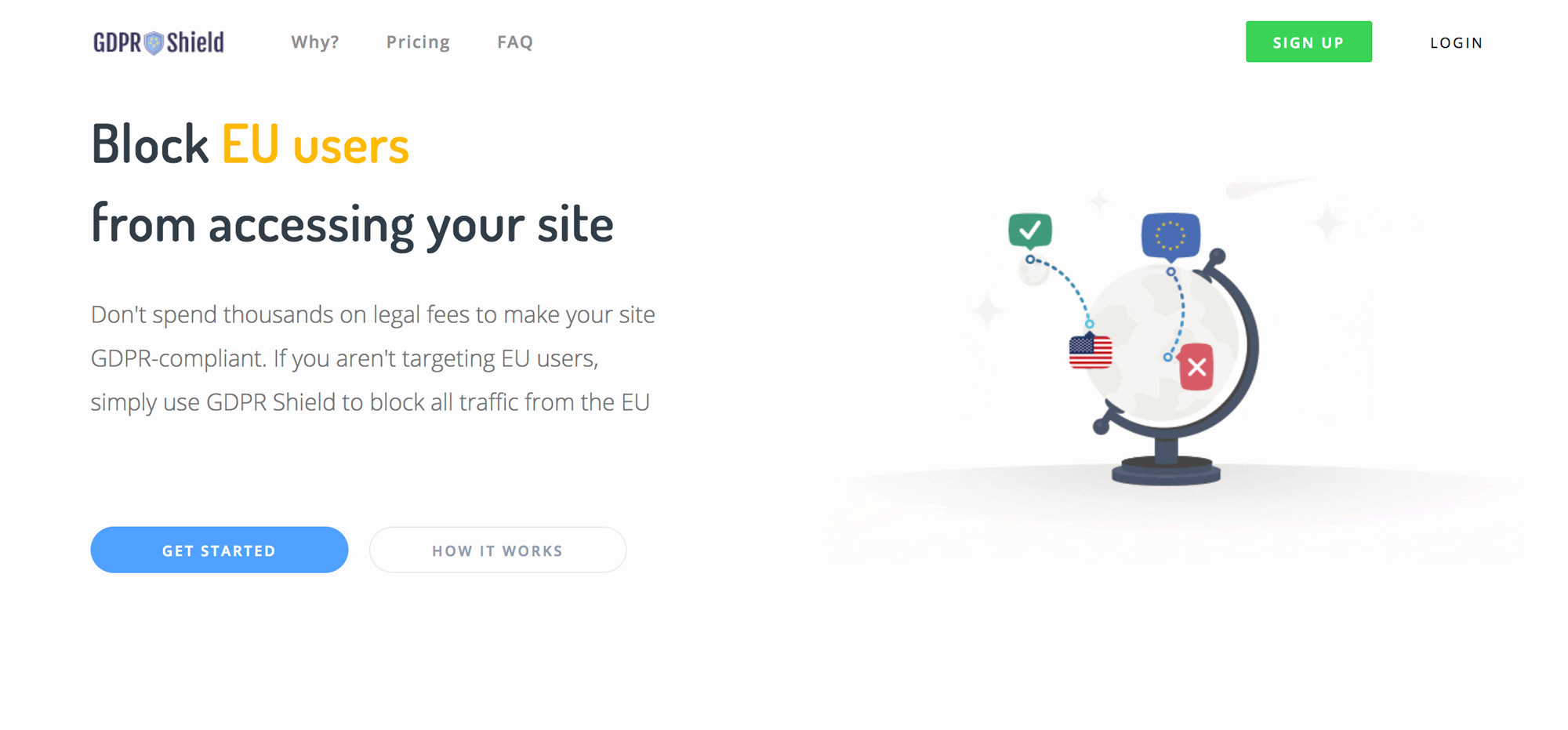 Son nom ? GDPR Shield, GDPR étant l’acronyme anglais du RGPD. Le site invite tout simplement les organisations situées hors de l’Union européenne à « ne pas dépenser des milliers de dollars en frais juridiques pour rendre votre site conforme au RGPD. Si vous ne ciblez pas les utilisateurs de l’Union, utilisez simplement GDPR Shield pour bloquer tout le trafic en provenance de l’Union ».