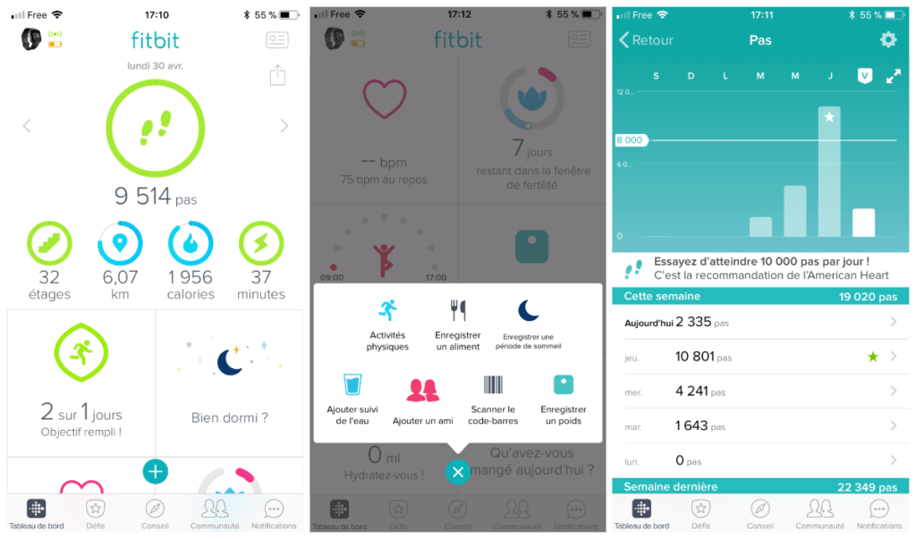 Pour compléter la montre, Fitbit invite son ou sa propriétaire à utiliser l’application mobile liée (sur iOS ou Android). Celle-ci fonctionne comme un tableau de bord, dans lequel la navigation s’est révélée plus agréable que sur l’écran de la Fitbit Versa. La page d’accueil affiche en un coup d’œil les principales données enregistrées par la montre, et permet de suivre sa progression si un objectif a été clairement défini dès le départ.