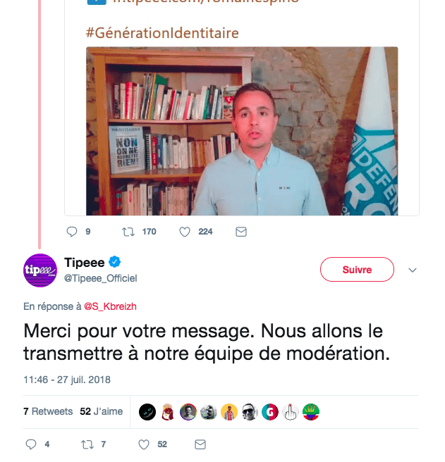 Sur Twitter, un internaute a interpelé Tipeee au matin du 27 juillet, assénant : « Ne soyez pas le seul site de #crowdfunding à financer la haine, le racisme et l’inhumanité des identitaires et des fascistes. Tous vos concurrents en ont pris conscience et s’y refusent. Faites comme eux, blacklistez le financement de la haine.» Le compte officiel de Tipeee a alors précisé avoir alerté « l’équipe de modération ».