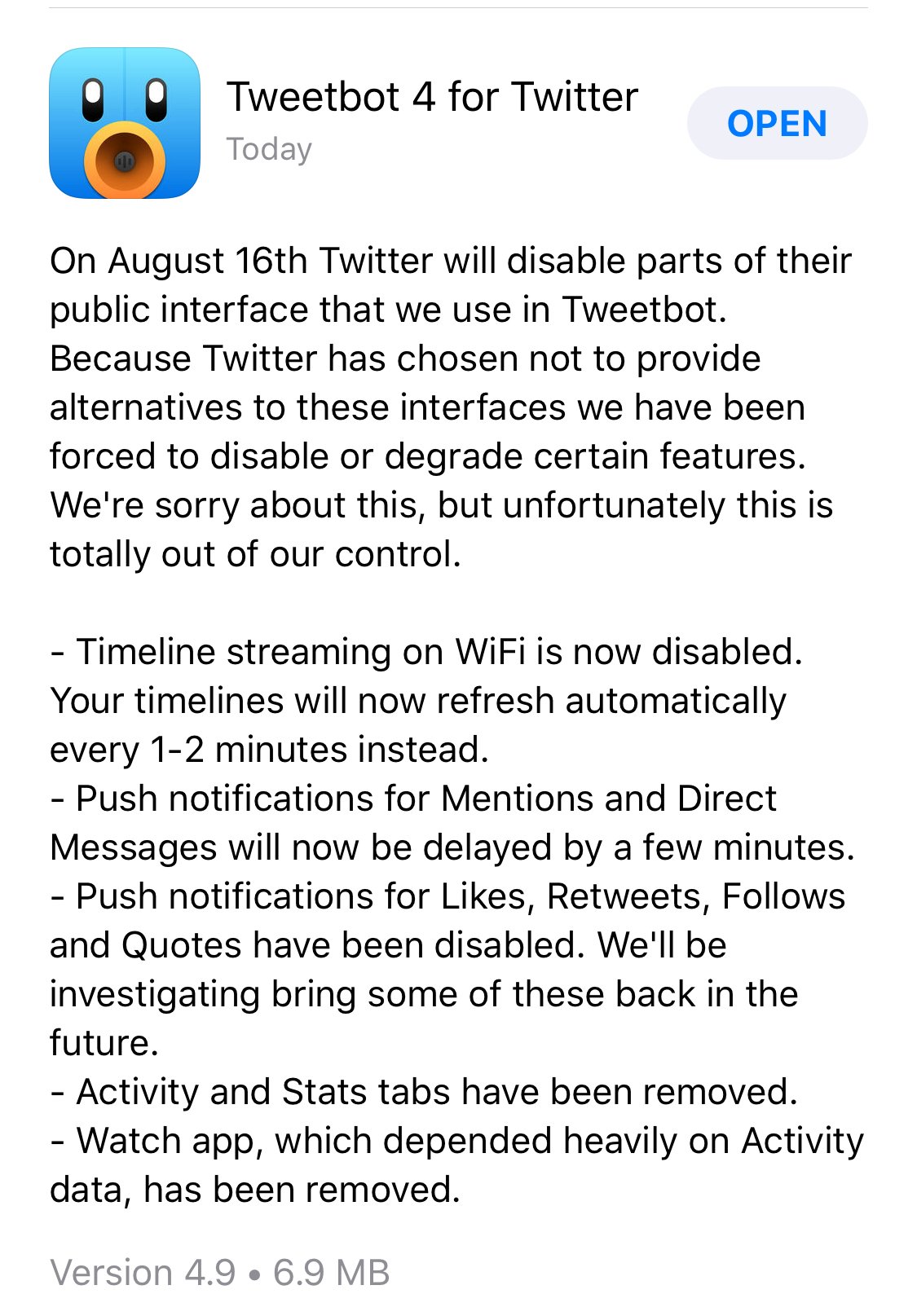 Tweetbot, l’une des applications les plus célèbres pour accéder à Twitter, en fait les frais et a publié le 15 août sa version compatible avec les nouvelles règles. Au programme, l’application perd beaucoup de fonctionnalités liées à un usage intensif du réseau social : la timeline ne se rafraîchit plus en direct en Wi-Fi (elle se rafraîchit que toutes les 2 minutes), les notifications push pour les likes, les personnes qui vous suivent, les retweets et les citations ne sont plus disponibles, les statistiques et l’activité ne sont plus accessibles et l’application Apple Watch disparaît. En plus, les notifications push pour les DM ou les mentions seront décalés à plusieurs minutes plutôt que distribuées instantanément.