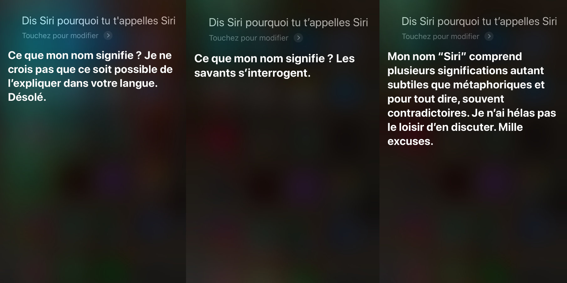 Contrairement à l’intelligence artificielle des appareils Amazon, Siri peut prendre une voix féminine ou masculine selon vos paramètres de configuration. Mais d’où peut bien venir son nom ? Lorsqu’on lui demande, Siri n’est pas très enclin à répondre. « Je ne crois pas que ce soit possible de l’expliquer dans votre langue », nous dit-il. Ou bien : « Mon nom Siri comprend plusieurs significations autant subtiles que métaphoriques et pour tout dire, souvent contradictoires. Je n’ai hélas pas le loisir d’en discuter. »