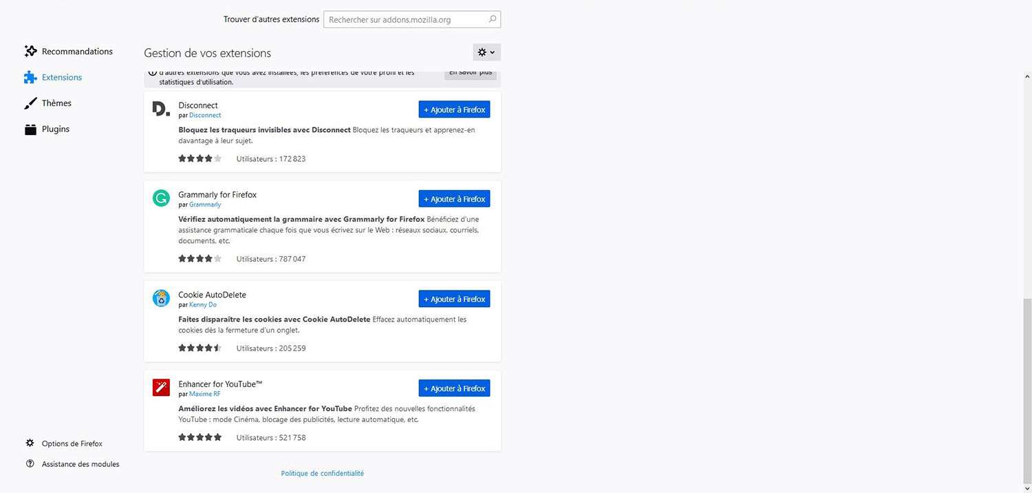 Un ajout qui a fait plaisir à l’EFF : « Nous sommes ravis que Mozilla mette l’accent sur la confidentialité et les extensions axées sur la sécurité, et nous sommes ravis que HTTPS Everywhere et Privacy Badger soient inclus dans cette liste », écrit l’association dans un message publié le 24 juillet. Si vous ne les trouvez pas dans la liste des modules recommandés, vous pouvez les retrouver par une recherche.