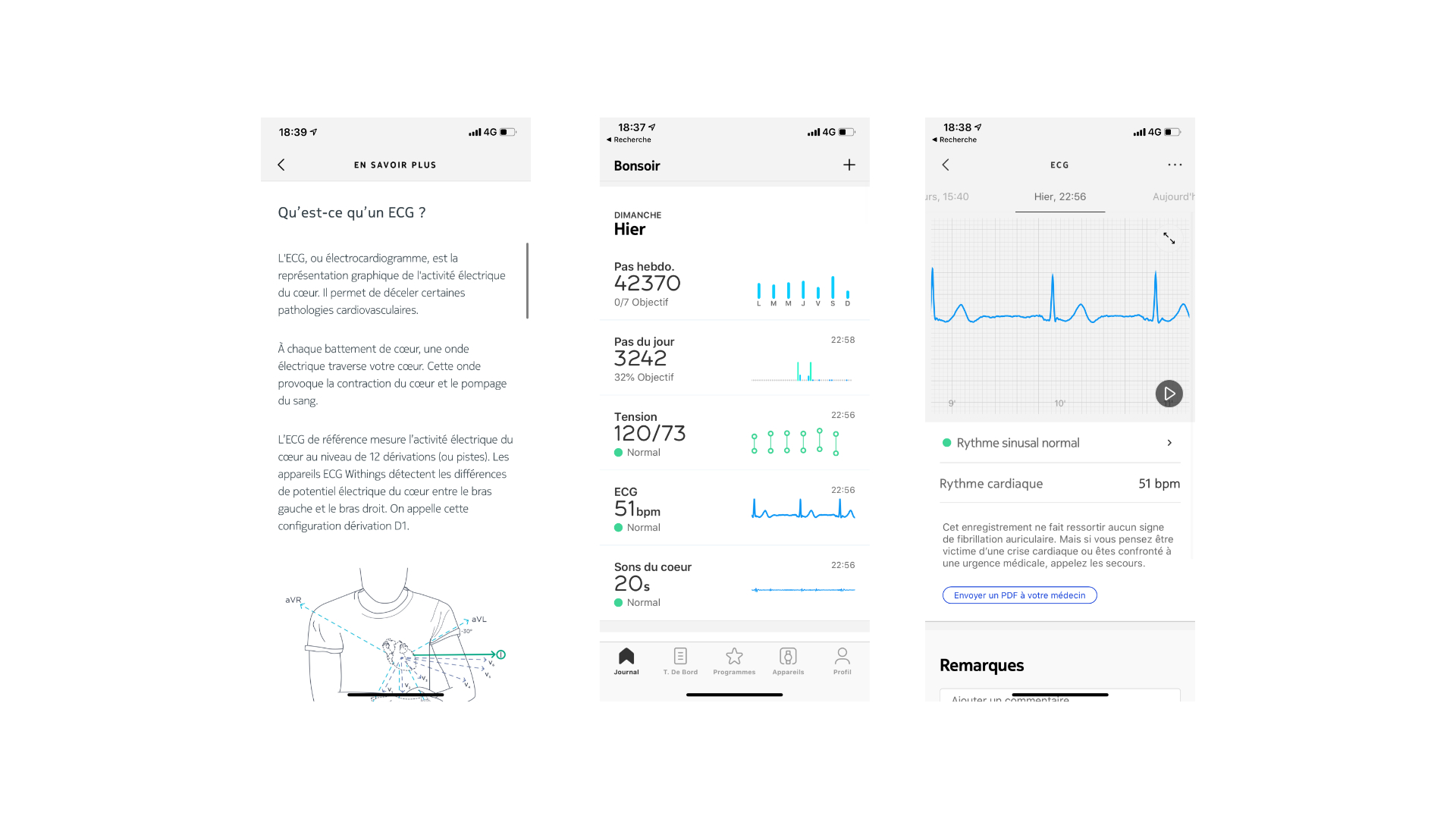 Sur votre smartphone, vous pouvez consulter les résultats et Withings apporte des informations très claires sur la méthodologie, les mesures et leur interprétation. Les écrans sont très pédagogiques et permettent de comprendre sans ambiguïté ce qui se passe dans notre corps. Le suivi n’est d’ailleurs pas entré uniquement sous forme de données : l’ECG par exemple propose une vidéo du tracé, ce qui permet à un médecin de voir exactement ce qui s’est passé pendant le relevé. Des options de partage permettent enfin d’envoyer un mail à un professionnel de santé contenant un bilan au format test, mais aussi des feuilles de calcul au format .csv et Excel.