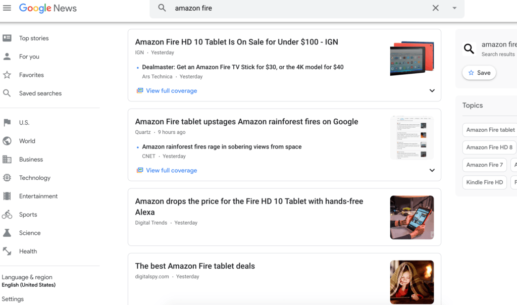 Source : Google TrendsC’est surtout sur Google News, l’onglet dédié à l’actualité, que le décalage est frappant. Quartz a remarqué que quasiment tous les résultats des requêtes « amazon fire » (et même « fire in the amazon » pour un résultat sur 6) menaient vers le produit tech, plutôt que sur la catastrophe écologique. En anglais, la forêt amazonienne se dit « Amazon rainforest ».