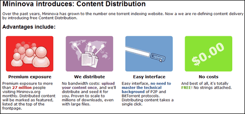 On savait Mininova soucieux de faire apparaître de lui une autre image que celle d’un vulgaire site pirate dont le seul but serait de faciliter la copie sans vergogne de millions de contenus diffusés sans autorisation. Début novembre, le site avait ainsi officialisé un partenariat avec le producteur de séries TV Red Band, qui assurait aux deux partenaires une promotion réciproque. Deux mois plus tard, Mininova lance son service Content Distribution, qui permet à n’importe quel producteur indépendant de profiter de l’exposition de Mininova et de BitTorrent pour faire connaître ses contenus.