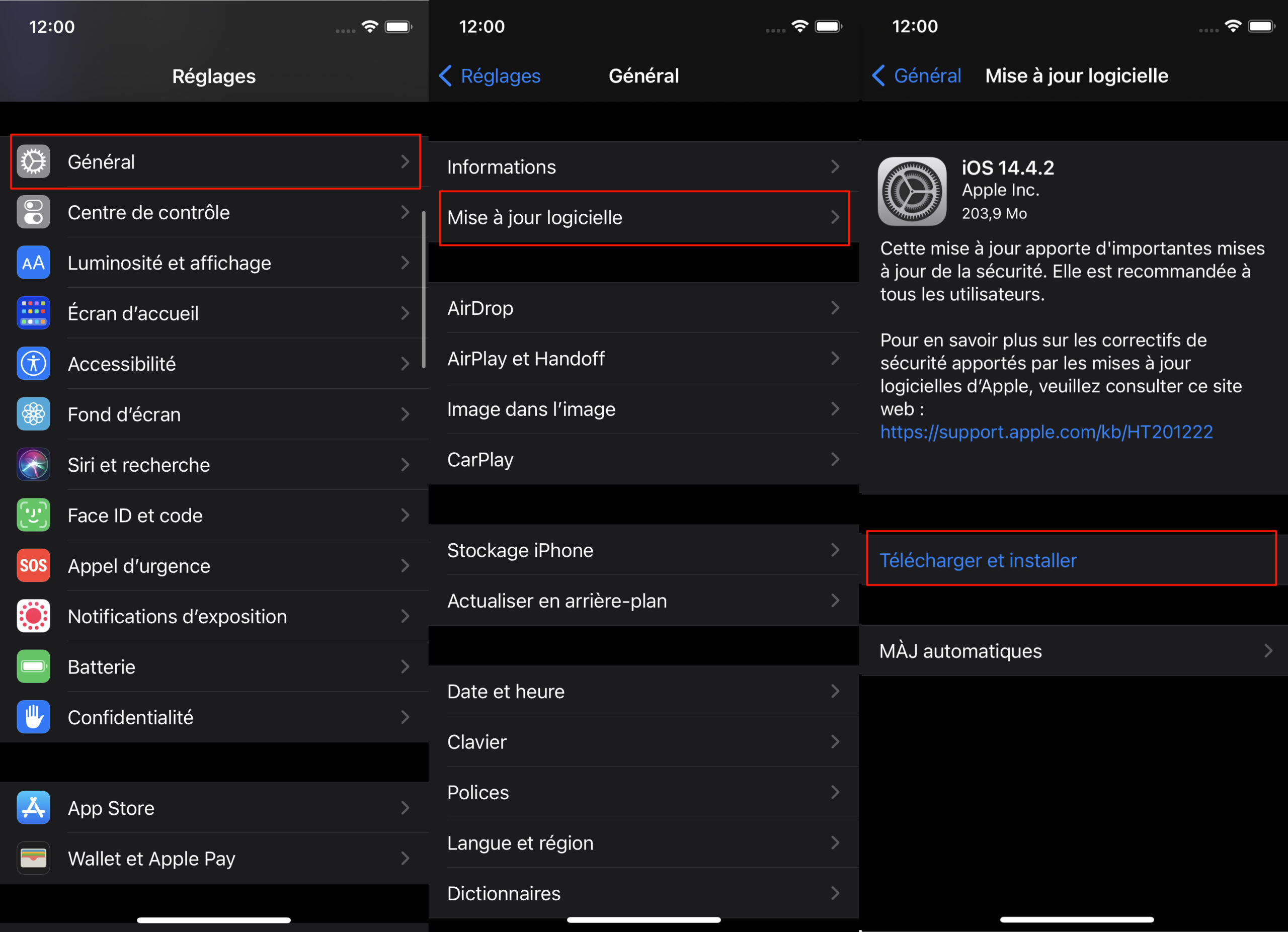 Les versions 14.4.2 d’iOS et d’iPadOS colmatent cette brèche, qui selon la documentation d’Apple, « a pu être activement exploitée » ces derniers temps. Il est donc primordial de faire la mise à jour au plus vite. Elle est disponible depuis le 26 mars 2021.