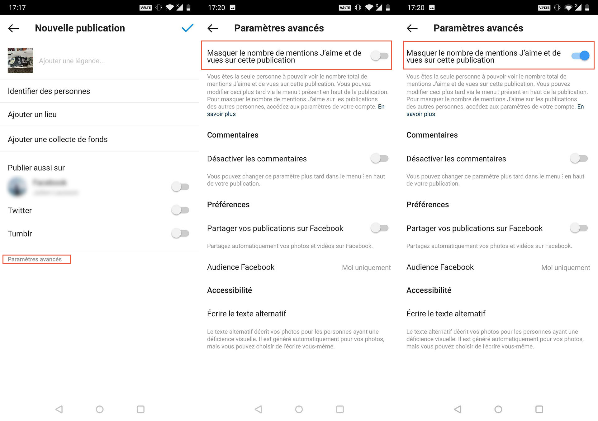 - Sélectionnez « Masquer le nombre de mentions J’aime » ;