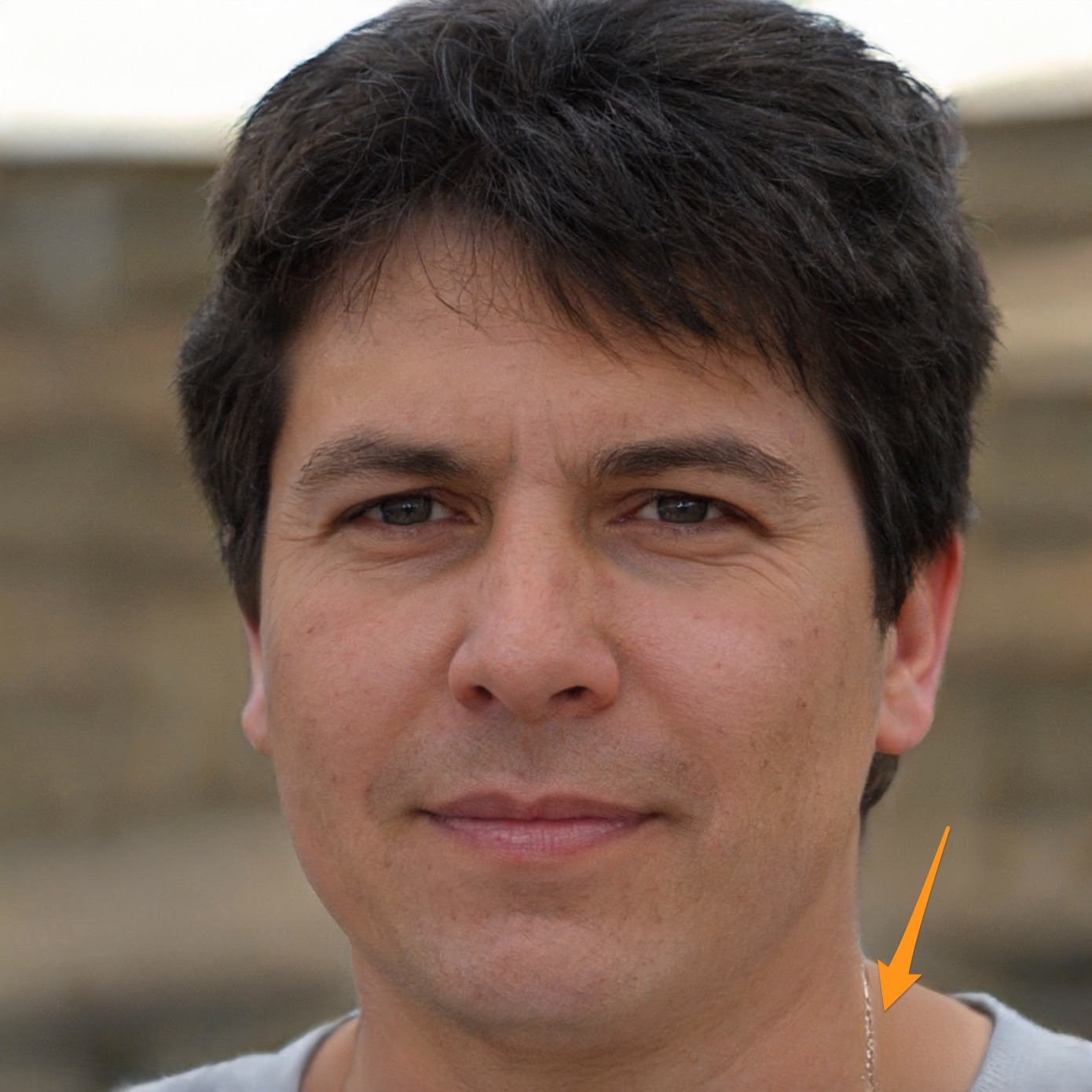 D’autres petits détails peuvent alerter : les cheveux ne sont pas cohérents, des accessoires tels que des boucles d’oreilles ou des cols apparaissent de manière étrange. Si une personne porte des lunettes, ces dernières sont également susceptibles d’avoir des défauts, que ce soit au niveau des branches ou des verres. Dans l’exemple ci-dessous, on voit ainsi que la chaîne n’est pas bien dessinée, et qu’elle semble disparaître avant le bord de la photo.