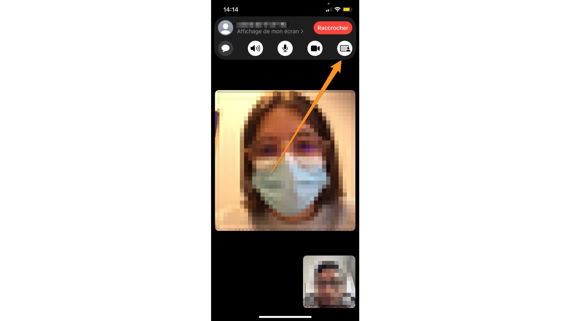 - Sur l’écran de l’appel, toucher l’icône en haut à droite (son logo montre un bonhomme devant un écran) ;