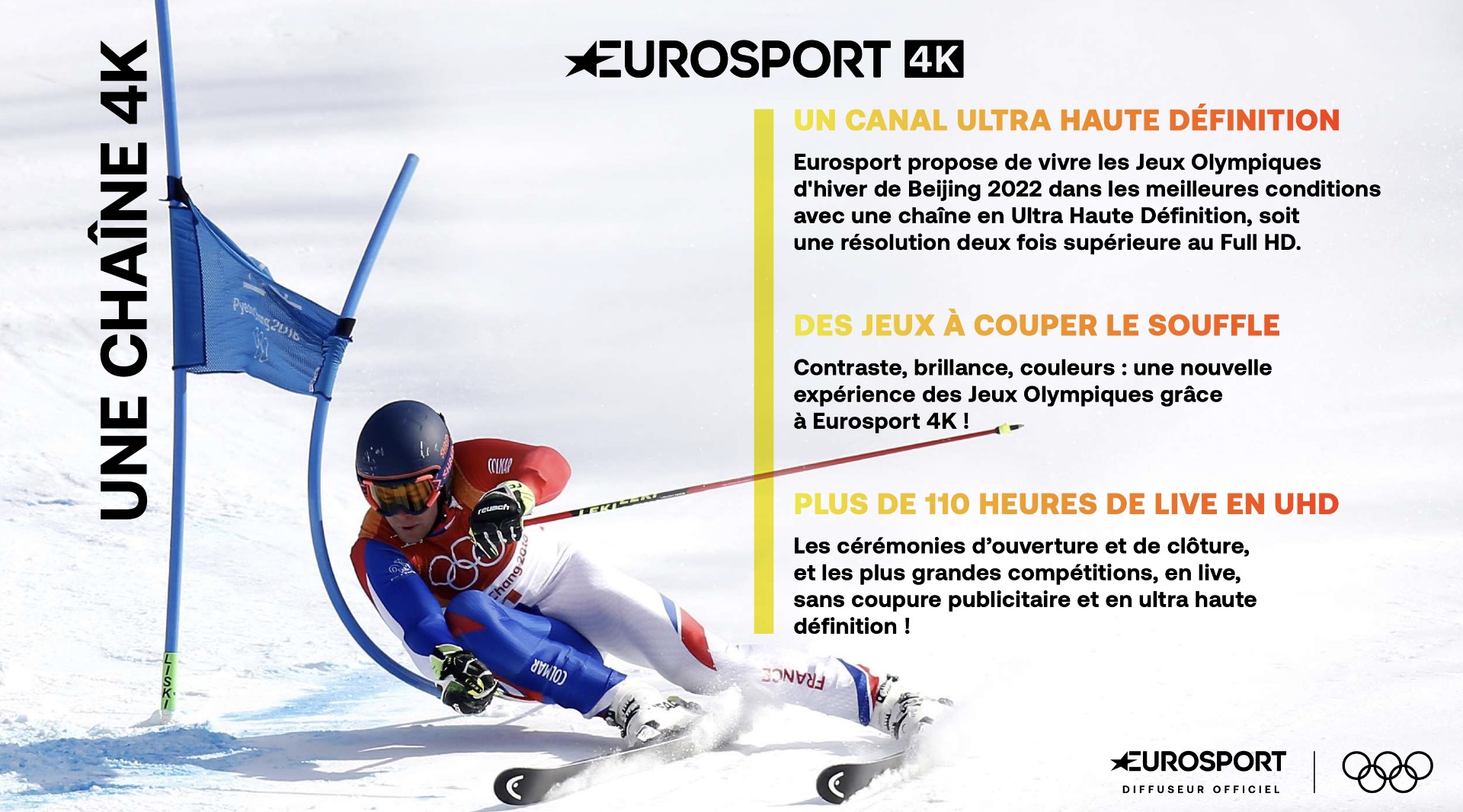 Comme Tokyo 2020, Beijing 2022 est co-diffusé par France Télévisions (360 heures de programmes, gratuit) et Eurosport (plus de 1 000 heures, payant). Les fans de sports d’hiver doivent s’abonner à la chaîne du groupe Discovery s’ils souhaitent regarder la compétition dans son intégralité… et en 4K. En effet, seul Eurosport proposera un flux 4K cette année. France TV, pourtant habitué à proposer des événements en cette qualité (Roland Garros), se contentera de Full HD à la télé et sur le web.