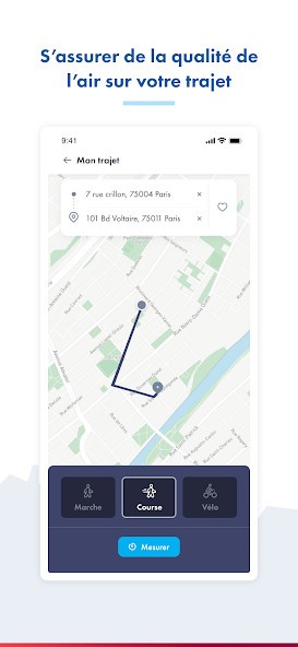 Pour ce faire, l’application vous offre la possibilité d’enregistrer en temps réel votre déplacement ou d’entrer une adresse de départ et d’arrivée spécifique. Cette variété d’outils de géolocalisation vous permet d’obtenir des informations détaillées sur la qualité de l’air dans différentes situations, vous aidant ainsi à prendre des décisions pour votre santé et votre bien-être.