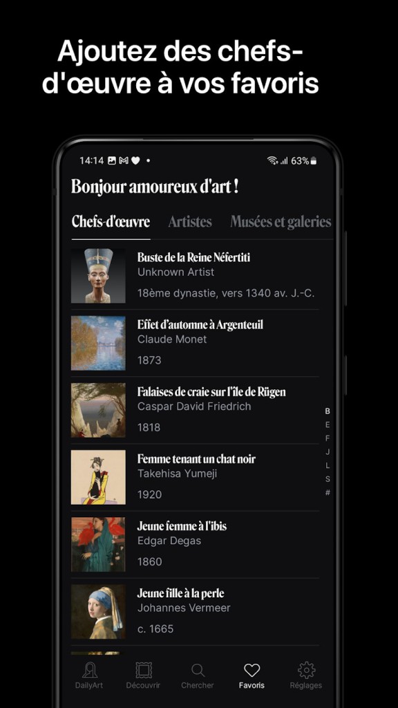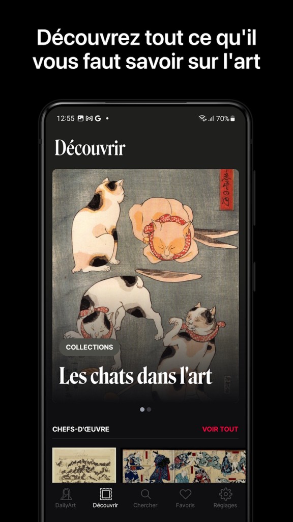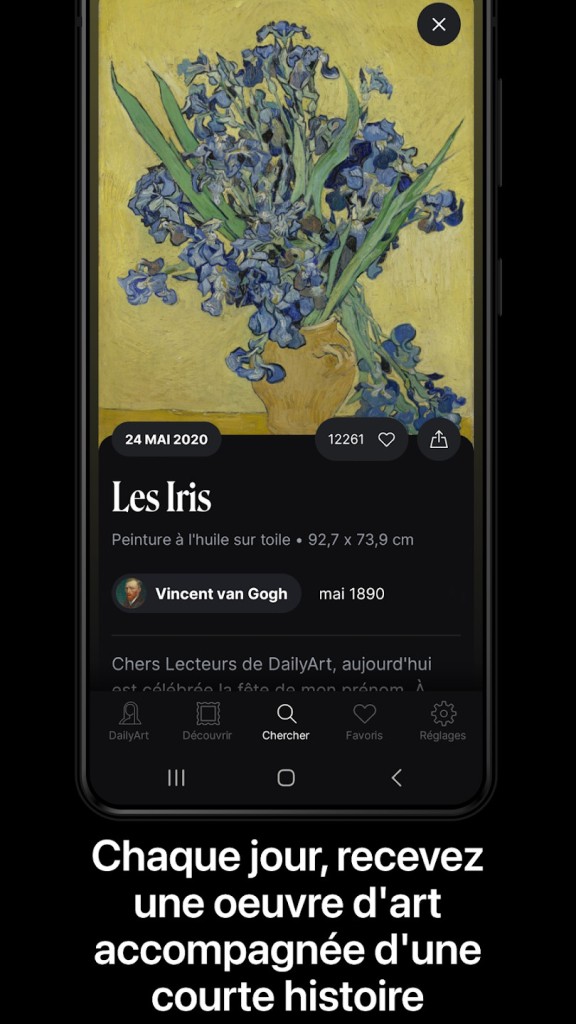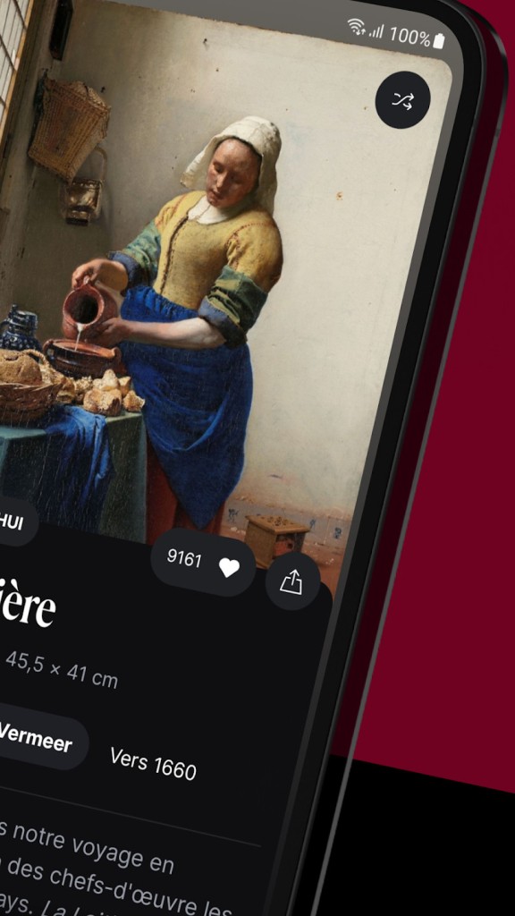 Grâce à une base de données riche de plus de 4 000 chefs-d’œuvre et 1 200 biographies d’artistes, DailyArt offre un véritable voyage à travers l’histoire de l’art. Vous souhaitez comprendre pourquoi Van Gogh s’est coupé l’oreille, percer les secrets de l’abstraction ou redonner vie aux femmes artistes oubliées ? Ouvrez DailyArt et laissez-vous guider. L’application vous permet de découvrir chaque jour une œuvre emblématique accompagnée d’un texte explicatif.