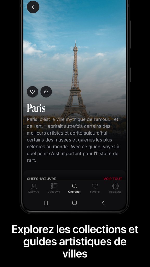 L’application intègre également un moteur de recherche avancé permettant de naviguer aisément parmi les œuvres et d’accéder rapidement aux informations souhaitées. Vous pouvez ajouter vos œuvres favorites à une liste personnelle, les partager avec vos proches et recevoir des notifications quotidiennes pour ne manquer aucune découverte.