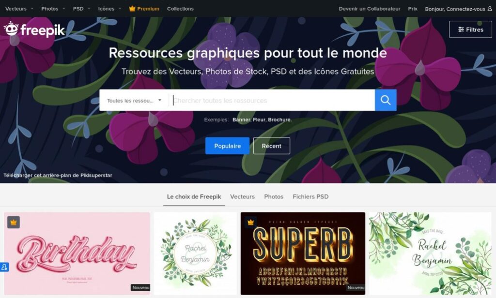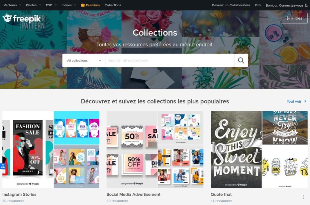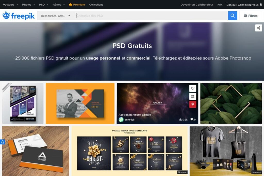 Freepik est une plateforme en ligne dédiée à la création et à la recherche de ressources graphiques (disponible sur n’importe quel navigateur). Elle propose une bibliothèque de ressources visuelles de la plus haute qualité, telles que des photos, vidéos, illustrations, icônes, vecteurs, modèles, PSD et même des mockups, gratuites, mais pas libres de droit.