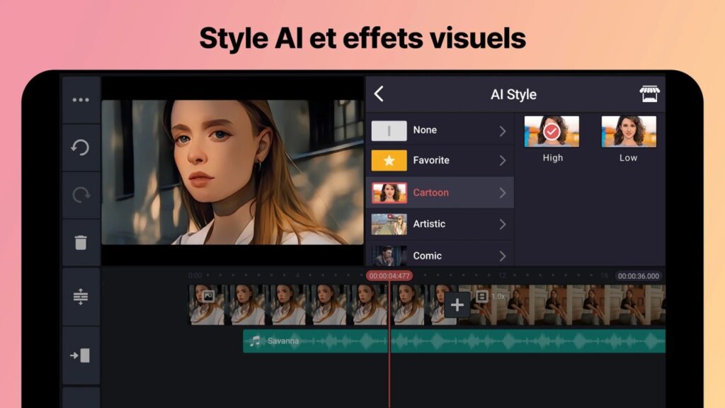 L’application offre une interface simple en français et inclut toutes les fonctions d’un logiciel de montage vidéo classique, ainsi que des fonctionnalités innovantes. Vous pouvez effectuer des tâches telles que couper, coller, assembler, rogner, ajouter du son et éditer entièrement votre vidéo. Parmi ces fameuses fonctionnalités innovantes, on peut citer la possibilité d’appliquer des calques vidéo, d’ajouter des images, des autocollants, des effets, des filtres de couleurs ou du texte. Vous pouvez également créer des effets originaux tels que l’inversion du sens des vidéos ou leur fusion entre elles. De plus, vous pouvez créer des effets de ralentissement ou d’accélération et ajouter du mouvement grâce au keyframing. Et une fois que votre vidéo est prête, vous pourrez l’exporter ou la partager sur les réseaux sociaux.