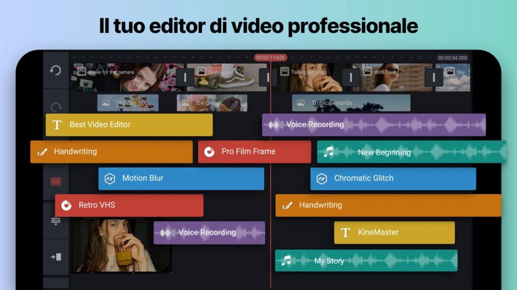 Comme la plupart des logiciels de montage vidéo, KineMaster met à votre disposition une timeline, permettant d’éditer, d’ajouter, de déplacer et de visualiser rapidement et simplement les différents éléments de votre vidéo.