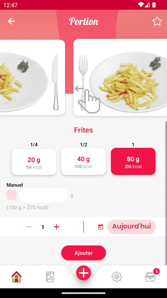 Vous devez ajouter au fur et à mesure les aliments consommés dans l’application en sélectionnant des portions à partir de photos claires et explicites. Une jauge visuelle vous indique en temps réel combien de calories il vous reste à consommer.
