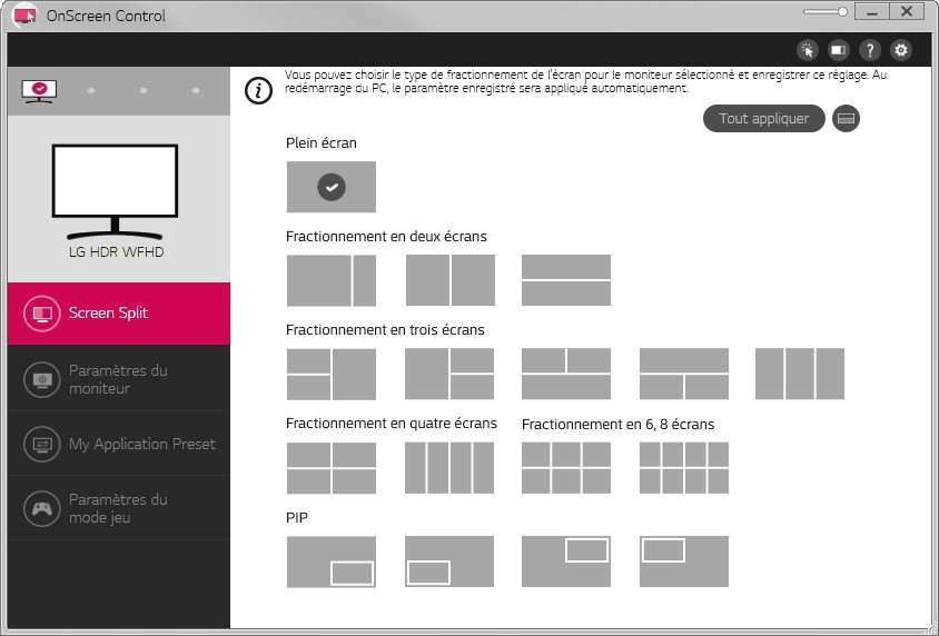 OnScreen Control fournit des informations complètes sur le moniteur LG connecté. Vous pouvez consulter les détails spécifiques de votre écran, tels que la résolution, les paramètres de couleur et d’autres caractéristiques importantes. Cette fonctionnalité vous permet de surveiller et d’ajuster les performances de votre moniteur avec précision.