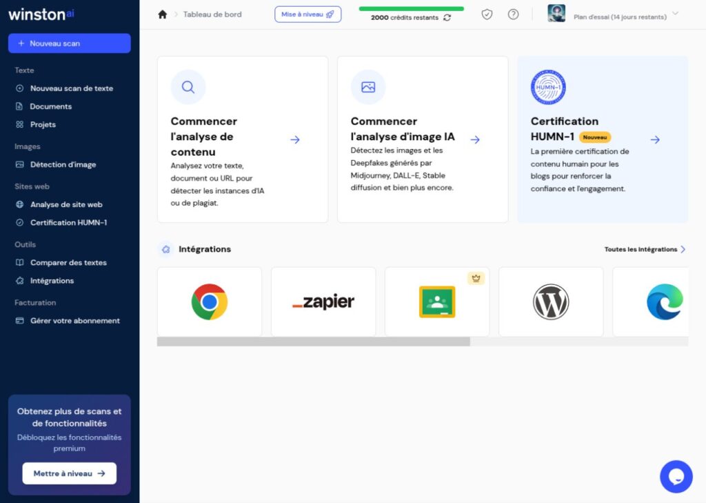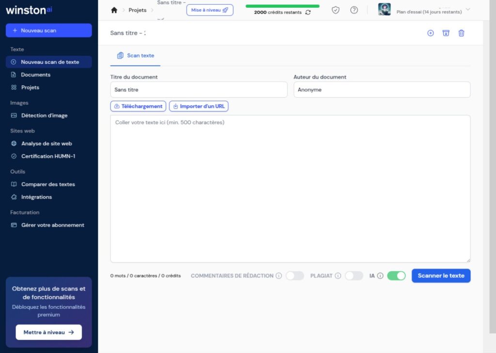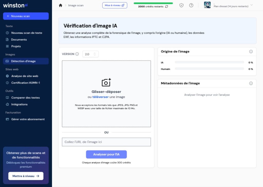 Winston AI propose une version gratuite valable 14 jours, incluant 2 000 crédits utilisables pour la détection de texte, d’images IA et l’analyse OCR. Cette formule d’essai est complète, elle donne accès aux fonctions essentielles telles que le téléchargement de documents, la détection multilingue, la génération de rapports PDF, la gestion de projets et l’assistance en ligne. Elle permet aussi de tester l’outil de détection d’images générées par des moteurs comme Midjourney, DALL·E ou Stable Diffusion.