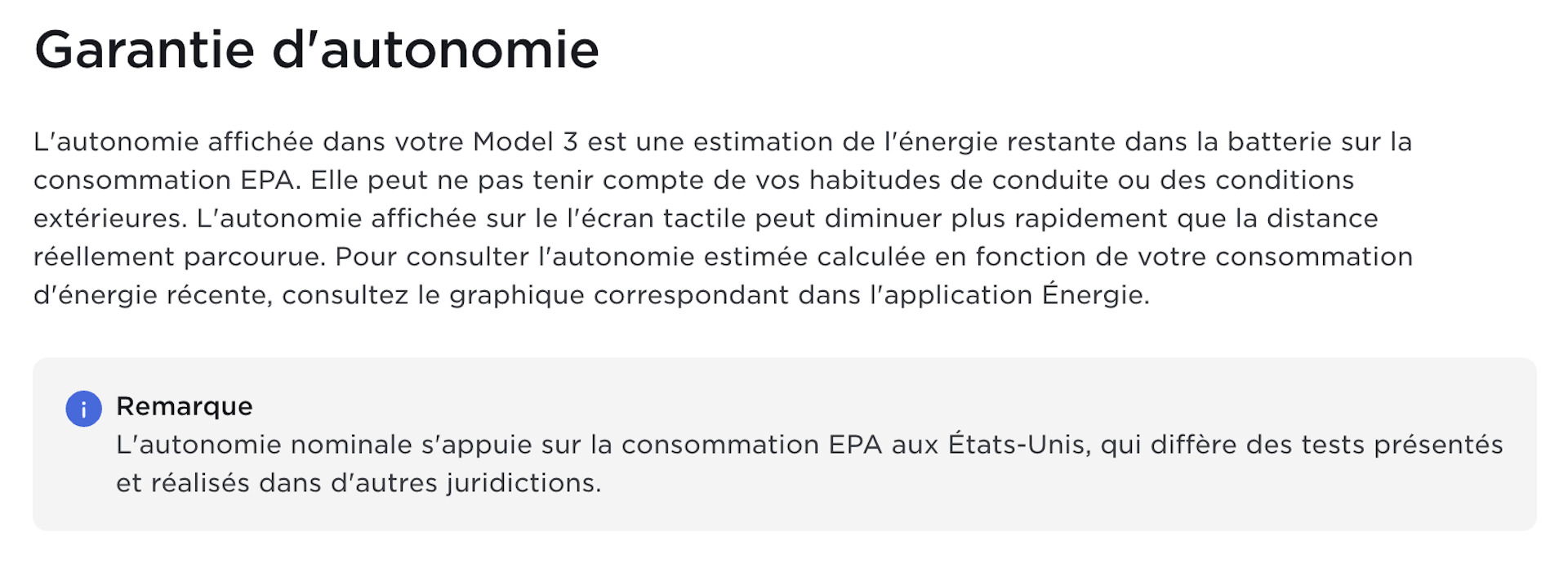 Tesla indique dans le manuel de ses véhicules que l’autonomie affichée ne tient pas compte des habitudes de conduite et des conditions climatiques. À la place, elle est basée sur une constante de consommation de l’agence de protection de l’environnement des États-Unis (EPA).
