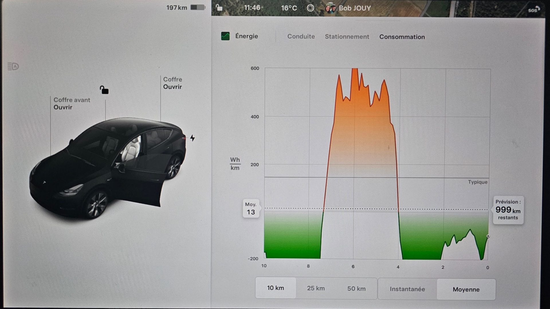 Il existe une application énergie sur les Tesla, symbolisée par une icône ressemblant à un graphique. Lorsqu’on clique dessus, un affichage de la consommation des 10, 25 ou 50 derniers kilomètres apparaît, ainsi qu’une estimation de l’autonomie restante si la consommation ne change pas.