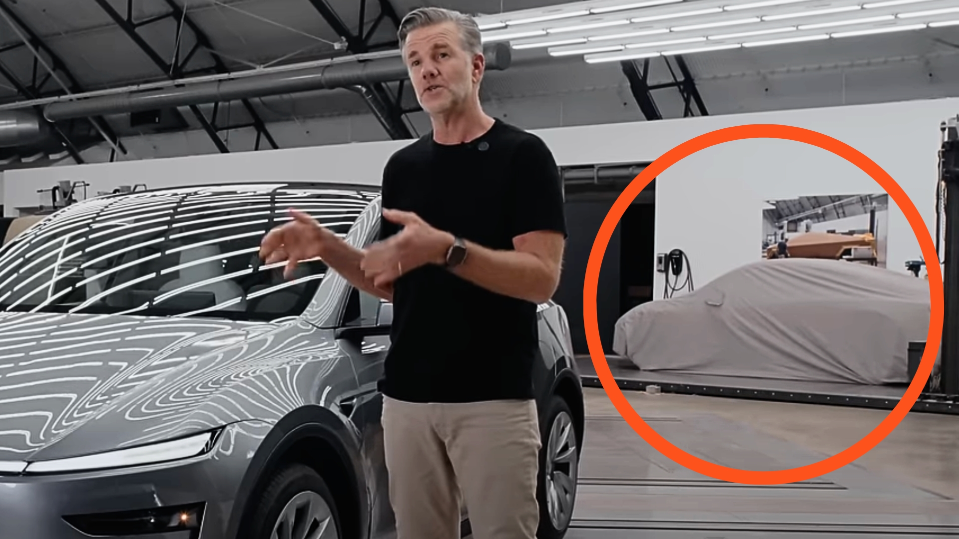Et il y a un détail, justement, qui nous a sauté aux yeux, alors qu’il n’a en revanche rien à voir avec le SUV restylé. En effet, lorsque le chef du design chez Tesla, Franz, parle de la refonte de l’identité visuelle du Model Y, on peut apercevoir dans le fond de la pièce un mystérieux véhicule.