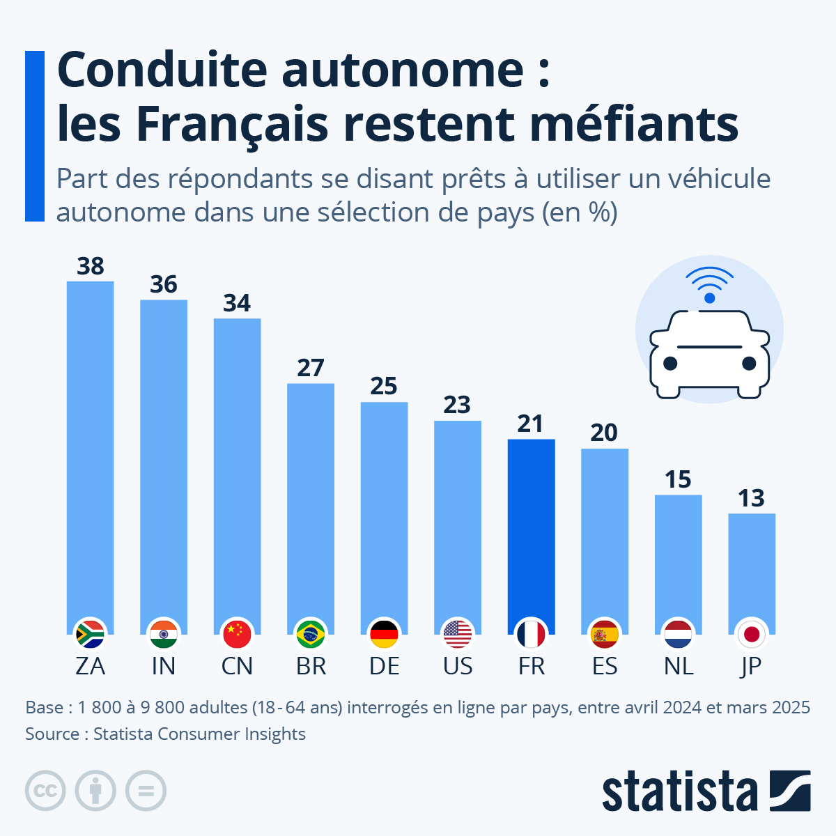 Conséquence de cette relative opacité, les assureurs peinent à enquêter sur les accidents et à évaluer correctement les risques. Quoi qu’il en soit, les Américains se montrent particulièrement méfiants vis-à vis des voitures autonomes. Selon un sondage mené par Statista dévoilé en juin 2025, à peine un adulte sur quatre se dit prêt à monter dans un véhicule autopiloté. Une confiance qui tombe à 21 % en France et même à 13 % au Japon.