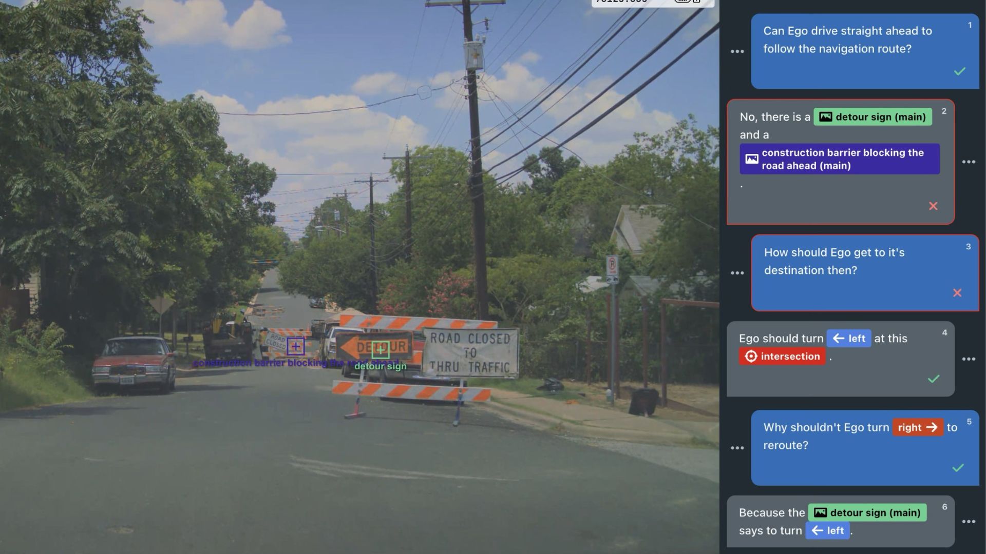 Dans un second exemple, le logiciel fait face à deux situations extrêmement similaires, mais dont la finalité ne doit pas être la même. Dans l’une une groupe de canards traverse la route et la voiture doit s’arrêter, dans l’autre un groupe d’oies attend au milieu d’un parking, mais n’a pas prévu de bouger. Le logiciel, suivant la logique humaine, comprend ainsi dans le second cas qu’il faut contourner les volatiles, car ils n’avanceront pas.