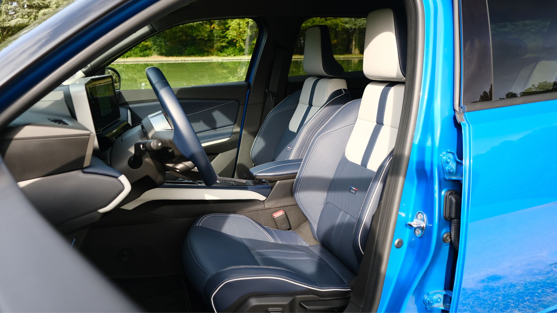 Sans surprise, l’Alpine A290 reprend trait pour trait l’habitacle de sa jumelle civilisée. Ce n’est pas une si mauvaise chose. En revanche, la sportive se distingue par une sellerie en textile enduit spécifique — de série — ou du cuir Nappa bleu et blanc cassé, comme c’est le cas dans ma version haut de gamme GTS. Même s’ils sont repris de la R5, les sièges offrent un excellent maintien, y compris en conduite sportive. Dommage que ces derniers ne soient pas réglables électriquement.