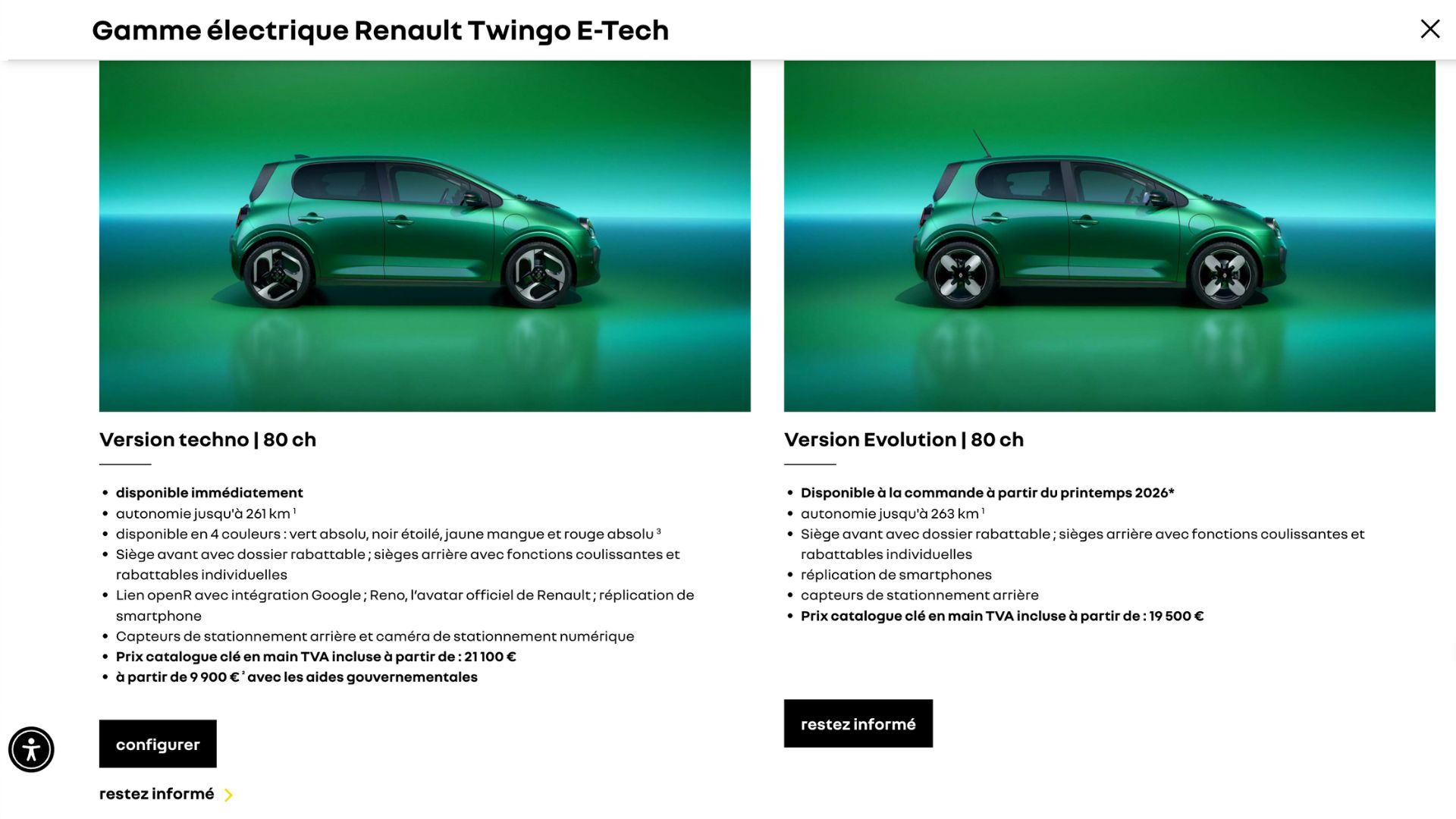 En ce qui concerne la version entrée de gamme de la Twingo baptisée Evolution, le configurateur italien souligne qu’elle sera disponible au printemps 2026. Le prix est fixé à 19 500 €, mais les aides de l’État auront déjà pris fin à cette période.