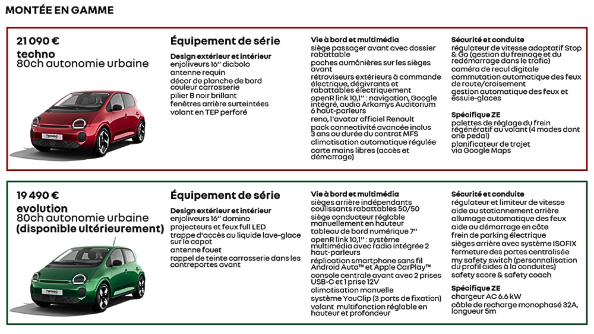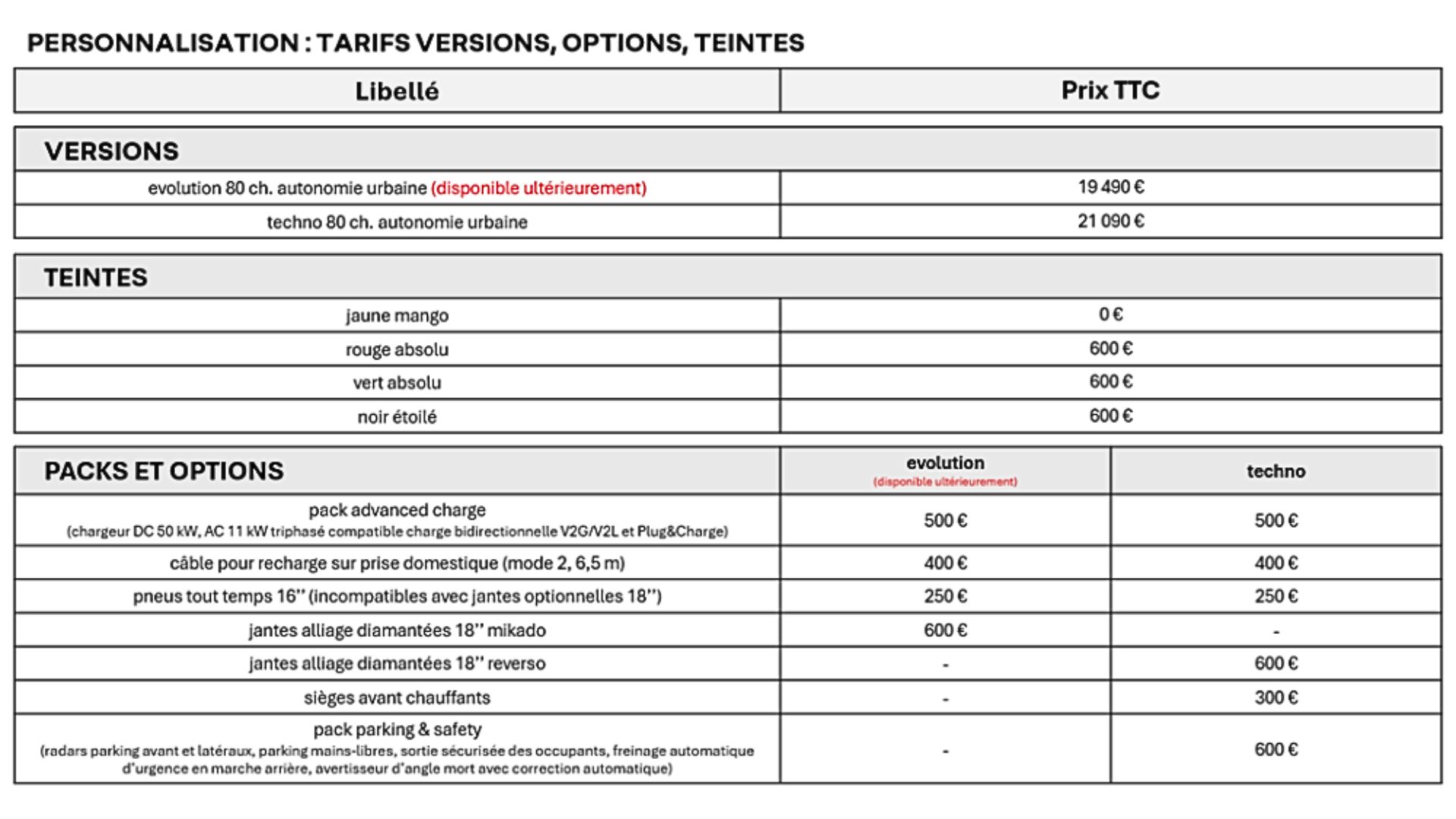 Le carnet de commandes pour la version « haut de gamme » Techno est ouvert, d’abord pour les détenteurs du Twingo R Pass, puis à compter du 8 janvier 2026 pour le grand public. La version entrée de gamme Evolution à moins de 20 000 € sans les primes sera disponible au printemps 2026.