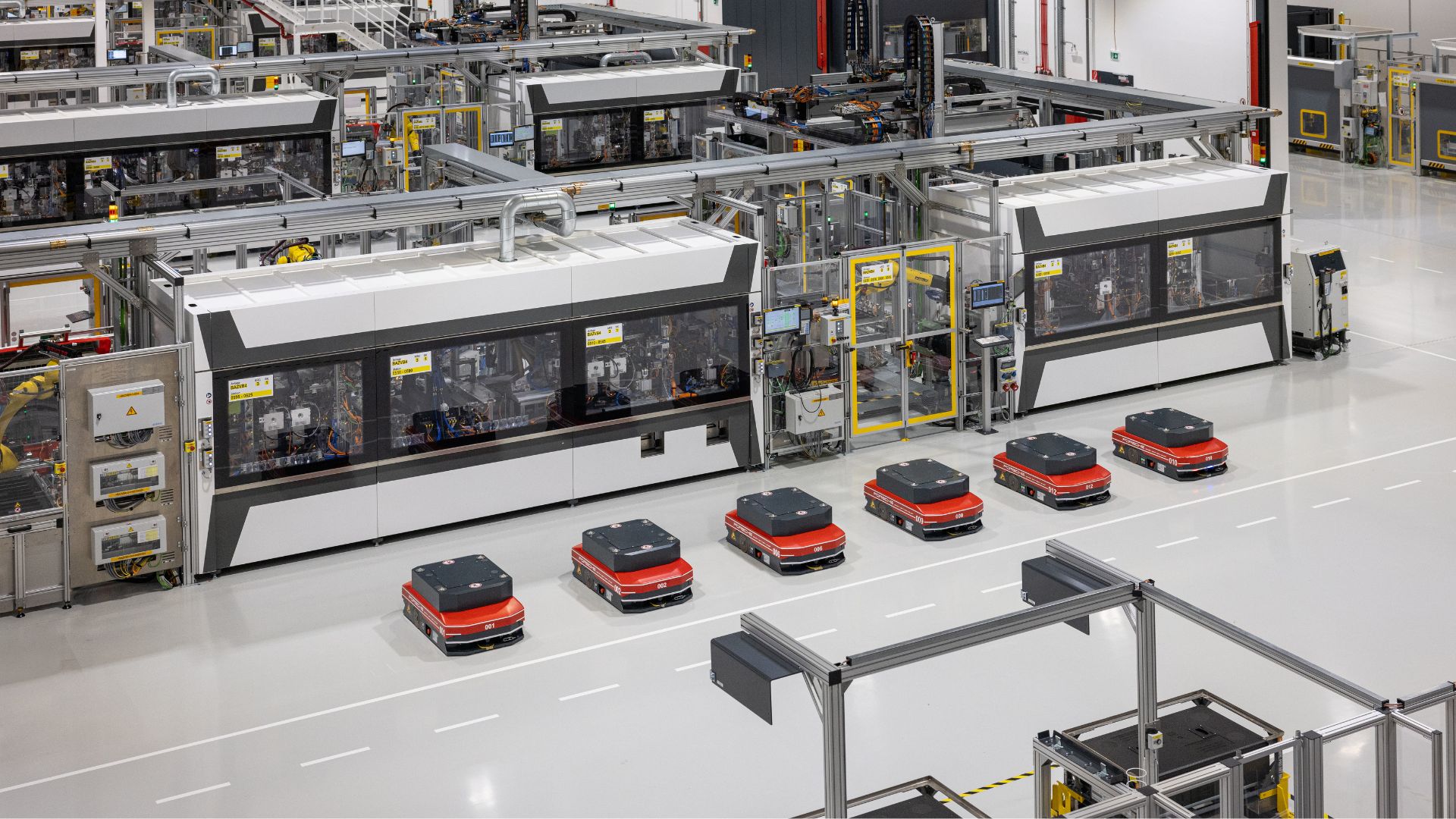 Mais ce n’est pas parce qu’il n’y a quasiment aucun humain qu’aucune vie n’existe à Horná Streda. En plus des bras robots, une ribambelle de mini-chariots autonomes — aux couleurs rouges des bolides des 24 Heures du Mans — s’activent entre les différents ateliers. Au total, 132 modules sont assemblés par heure, soit 22 batteries (6 modules par batterie) de *Cayenne Electric*.