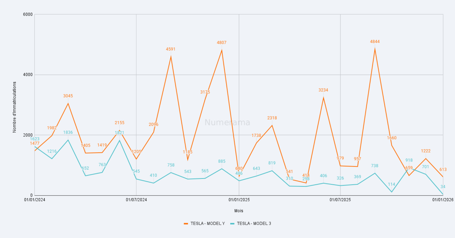 Tesla n’a enregistré en janvier 2026 que 661 véhicules, dont 613 Model Y. Si le Model Y a déjà connu pire, en mai dernier, avec seulement 414 immatriculations, le reste de la gamme était alors a minima soutenu par la berline électrique. Sauf qu’en janvier 2026, la Model 3 n’a pas dépassé les 36 exemplaires. Un score historiquement bas, que le modèle n’avait encore jamais atteint, y compris lors de précédentes phases de transition (au moment du renouvellement).