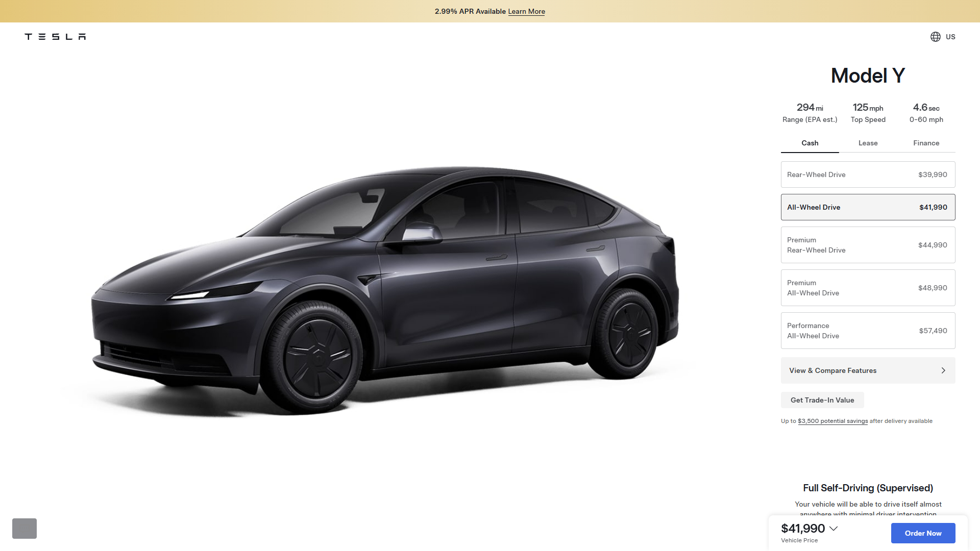 Cette nouvelle version AWD (transmission intégrale) du Model Y vient se positionner entre la version Standard Propulsion à 39 990 dollars et les déclinaisons Premium Grande Autonomie à 44 990 dollars. Tesla n’a communiqué aucune évolution technique majeure. Il s’agit avant tout d’un ajustement de gamme, pensé pour répondre à une demande plus sensible au prix après la disparition du crédit d’impôt fédéral américain de 7 500 dollars.