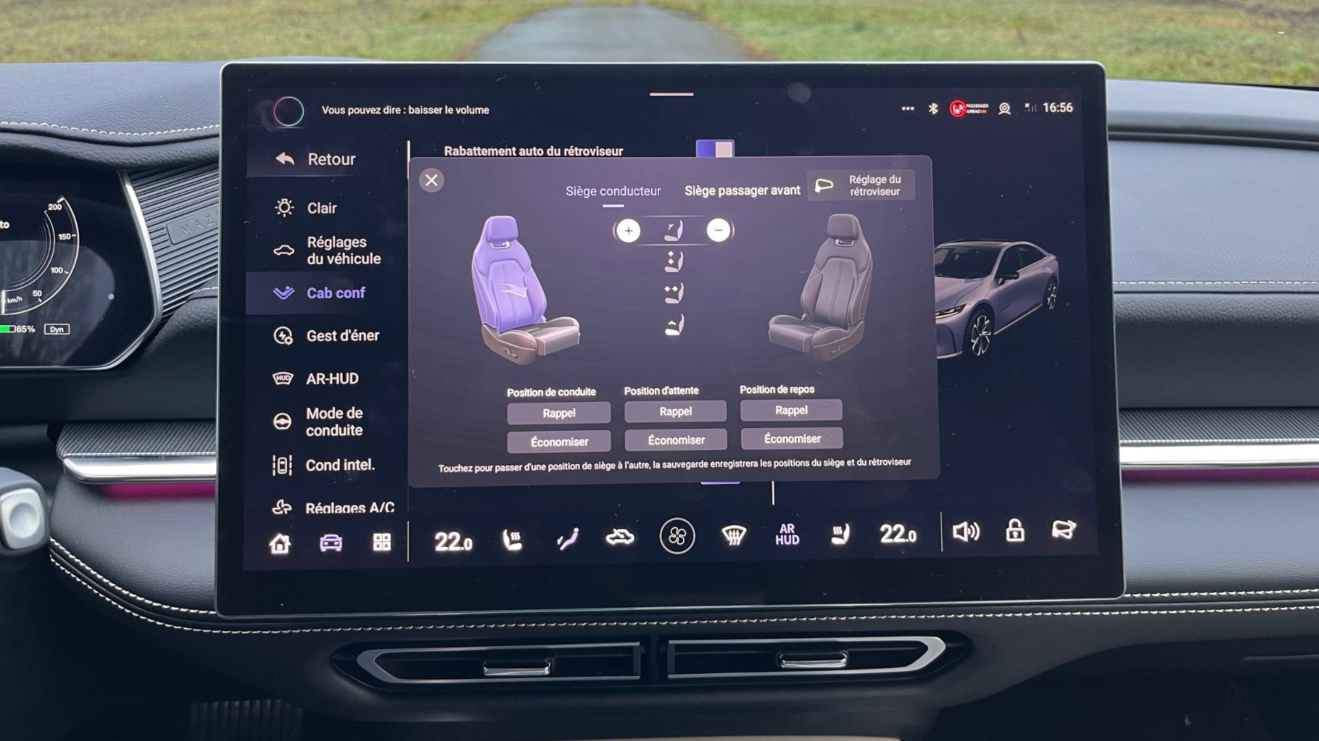 La 6e a un vrai problème d’ergonomie. Par exemple, l’activation du chauffage du volant ne se trouve pas — comme dans toutes les voitures — dans le menu de climatisation, mais est située dans le panneau de contrôle latéral à faire glisser (si on y arrive) ou dans le fin fond d’un autre menu. Pour l’avoir en un clic, il faut le mettre en raccourci sur l’un des deux boutons « favoris » à gauche du volant. D’ailleurs, j’en ai profité pour ajouter au second bouton le réglage du freinage régénératif, qui se règle sinon uniquement en allant dans les profils de conduite (mode individuel).