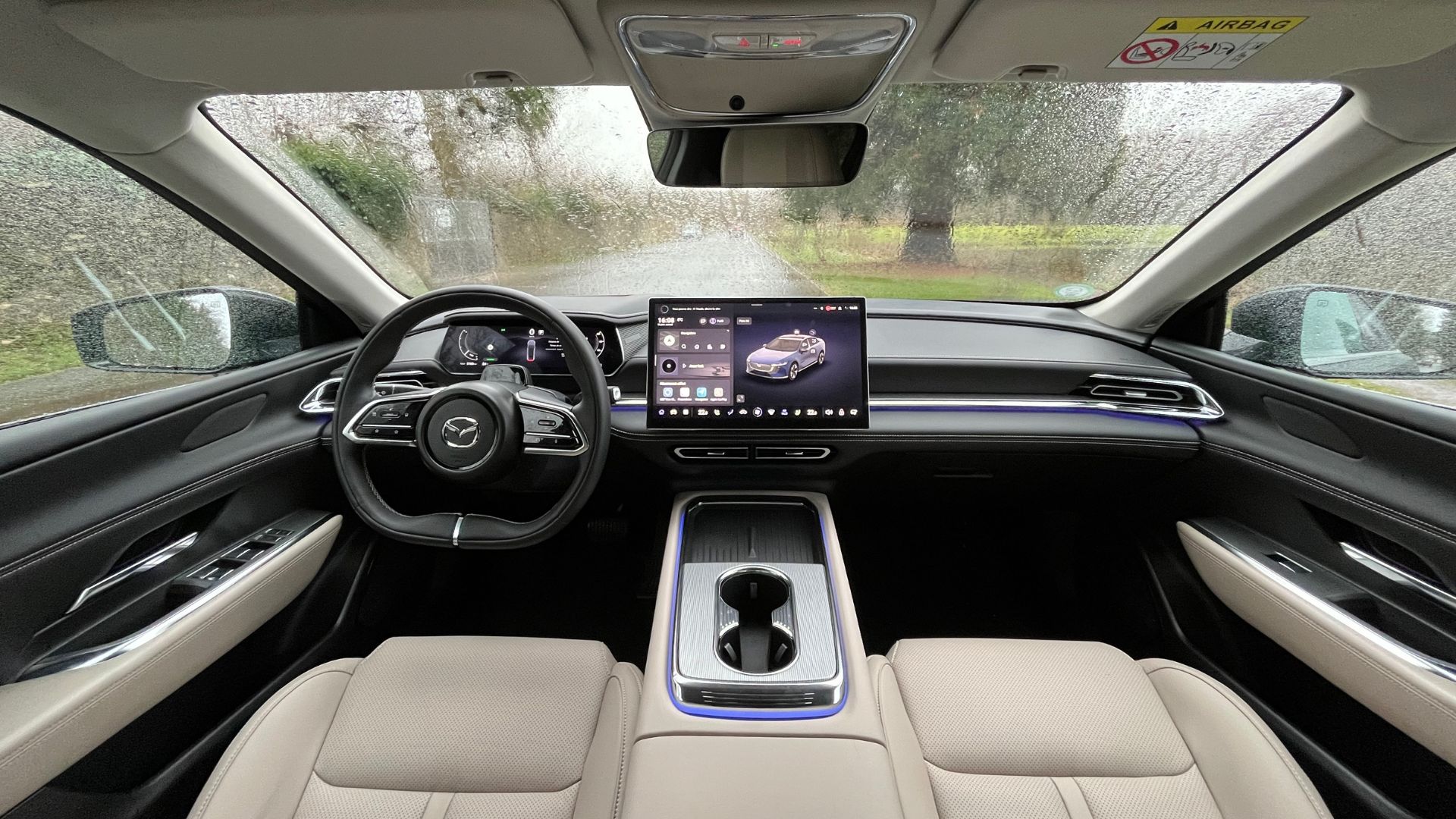 À bord, on remarque clairement qu’il s’agit là d’une Mazda sous influence chinoise. Tout est plus épuré comparé aux autres modèles du constructeur et seul réside un écran tactile de 14,6 pouces au centre. La console centrale a été complètement débarrassée des multiples boutons et autres molettes pour laisser place à un rangement dans l’accoudoir, deux chargeurs à induction (dont un ventilé) et deux porte-gobelets. D’ailleurs, ces derniers sont intégrés dans un plastique façon aluminium pas forcément des plus flatteurs.