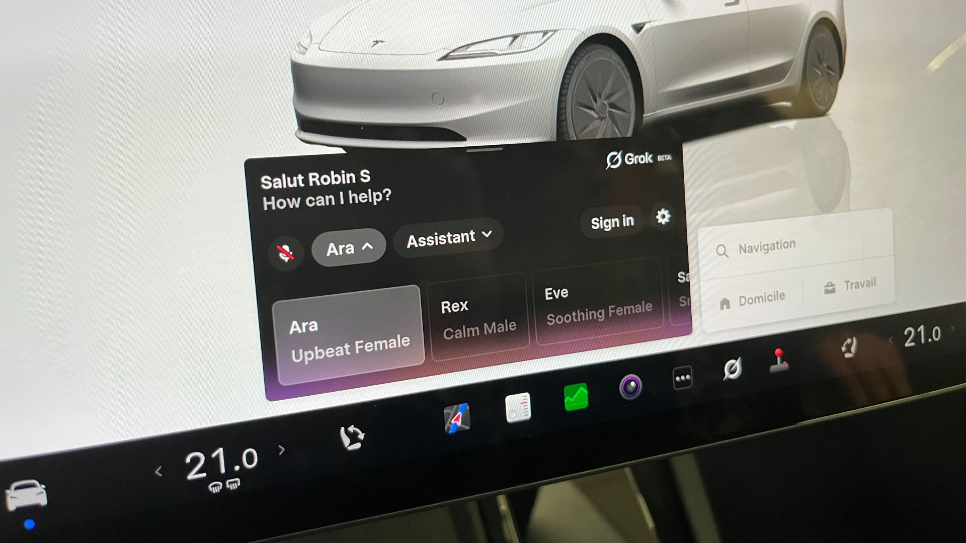 L’exemplaire que j’ai à l’essai a reçu la dernière mise à jour qui ajoute l’assistant vocal Grok, développé par la filiale xAI d’Elon Musk. Un gadget encore perfectible qui se montrera surtout utile pour la navigation (trouver un Superchargeur, définir un itinéraire précis ou aller à un restaurant avec de bonnes notes). Pratique pour éviter de manipuler l’écran tactile en conduisant.