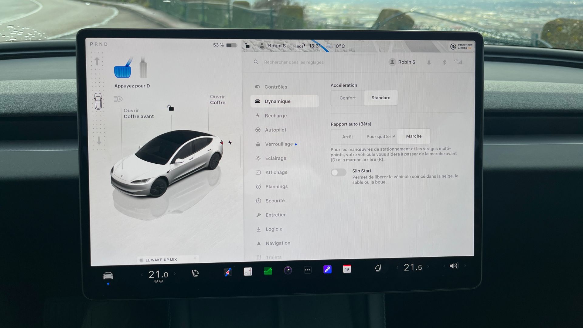 Le freinage régénératif est parfaitement calibré. En revanche, impossible d’avoir un autre réglage que le mode One Pedal dans les paramètres contrairement au Model Y. Seule l’accélération est ajustable sur deux niveaux. Dans le cas où il faudrait utiliser la pédale de frein, la course se montre suffisamment consistante et offre un bon feeling.