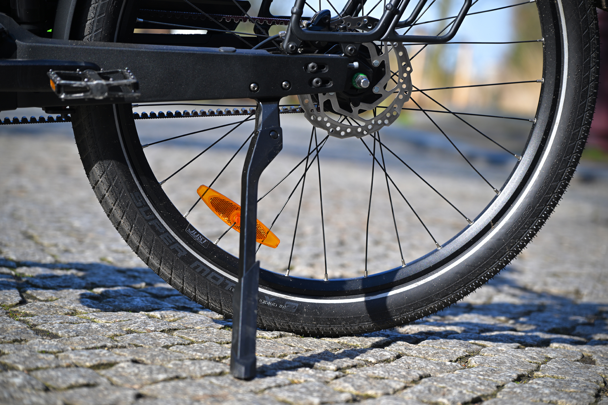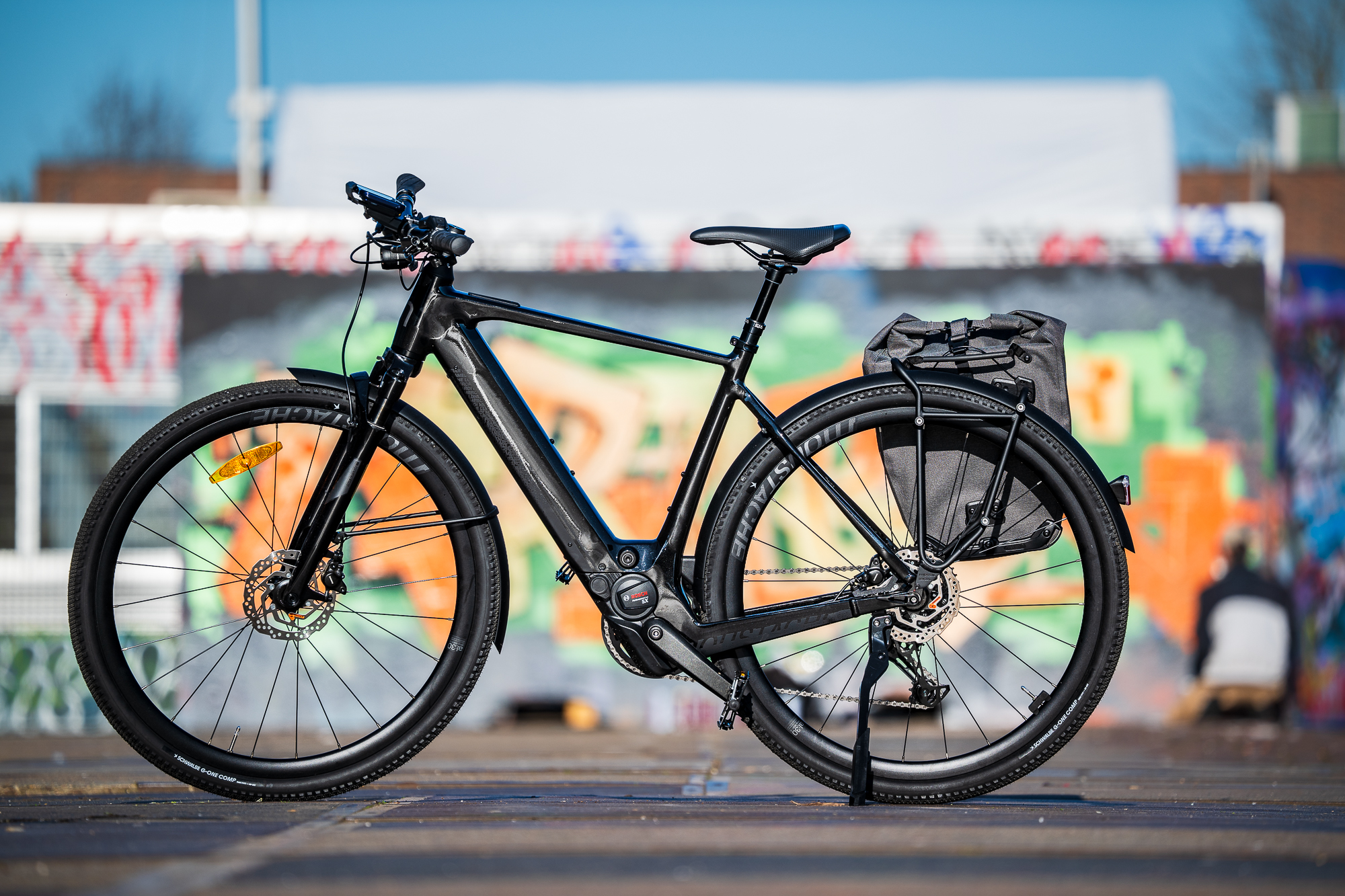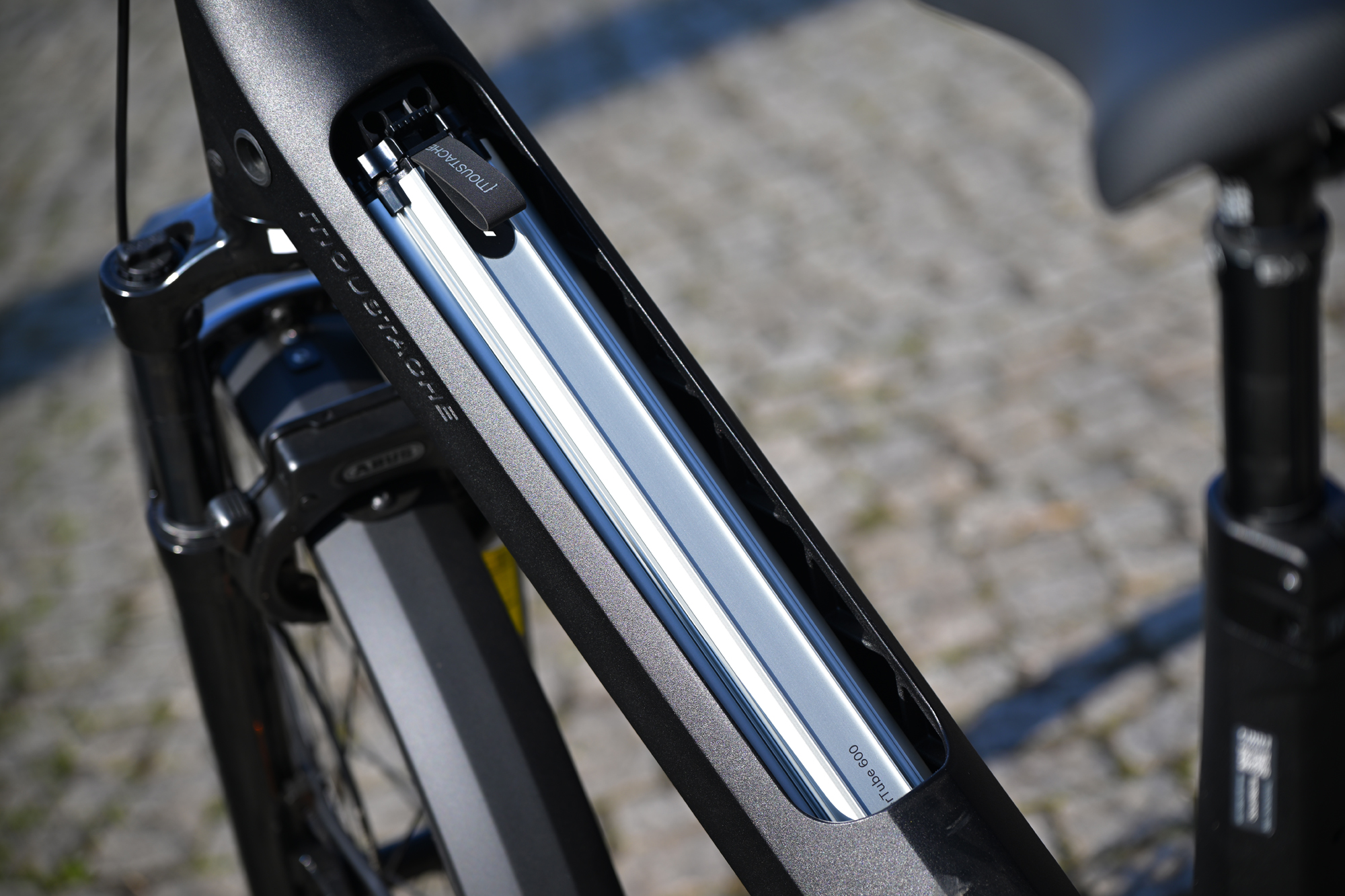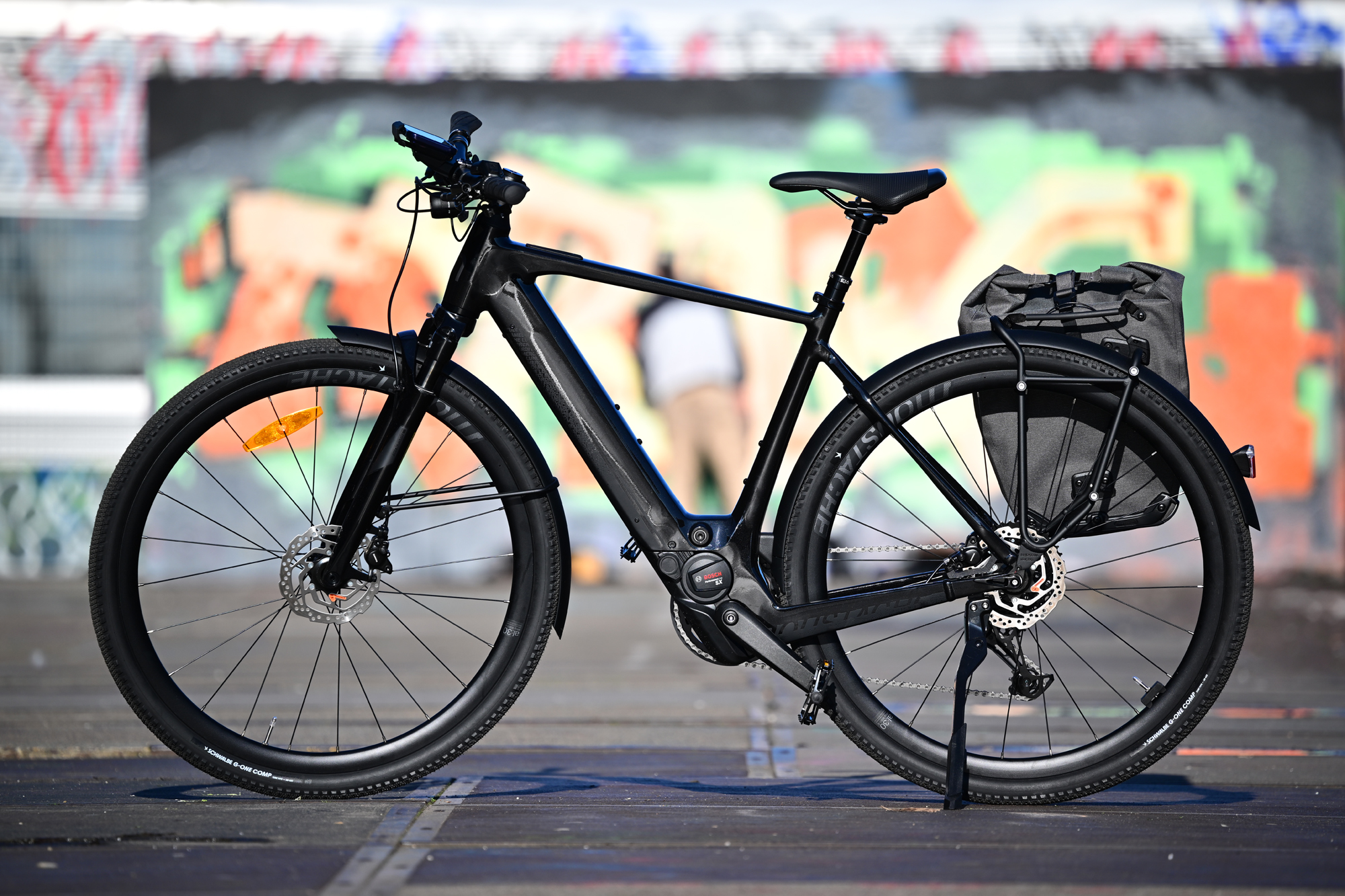 Les 20,2 kg sur la balance sont un paradoxe : énormes pour les habitués du musculaire lisant la fiche technique, peu pour quiconque fera quelques tours de roue avec. À ceci s’ajoute un porte-bagages à la norme QL3, une batterie de 400 Wh et une selle à tige suspendue. Le freinage hydraulique et les garde-boues sont également de la partie.