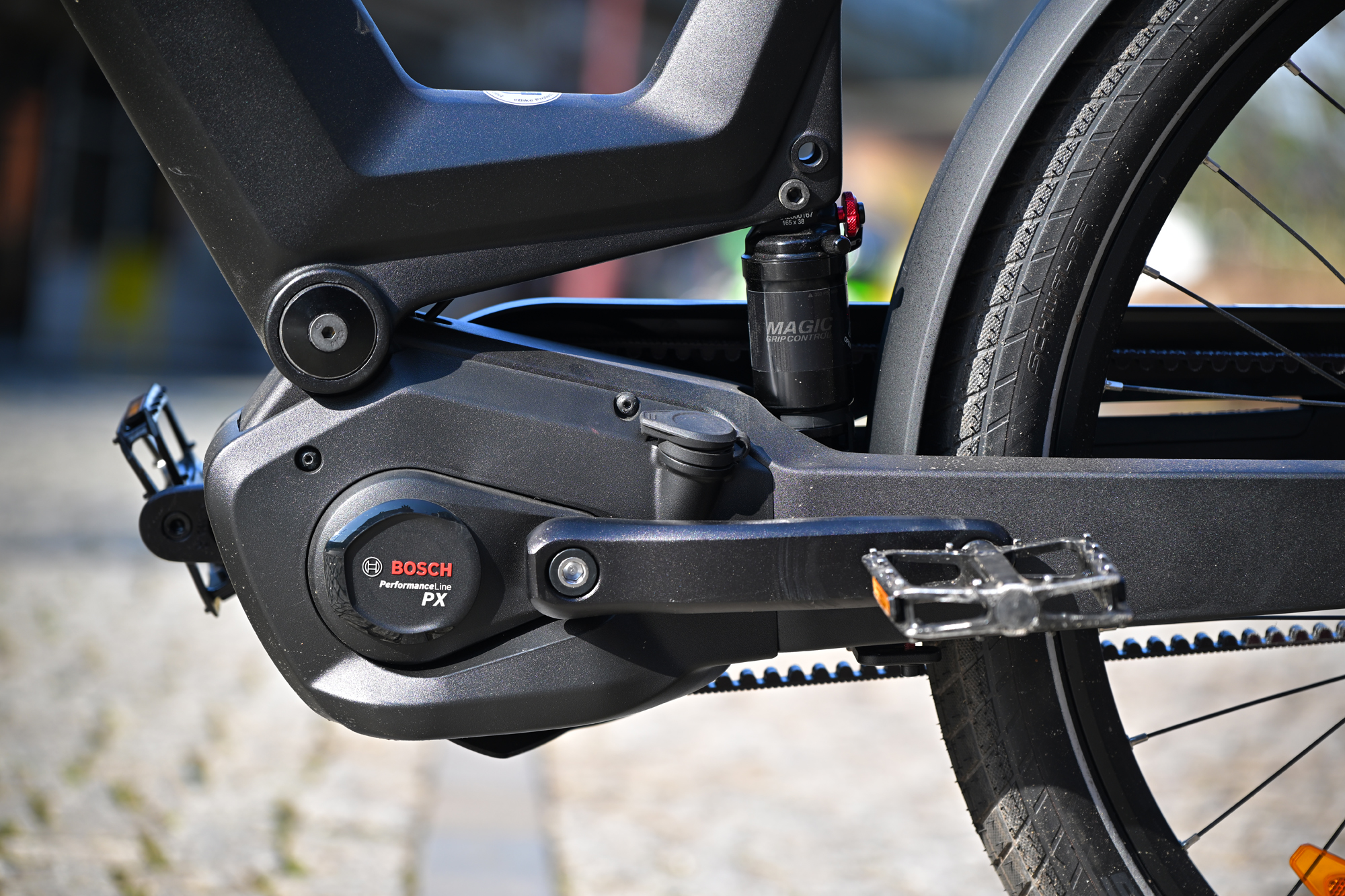 En second, c’est l’amortisseur à air Magic Grip Control 115 à deux positions (et offrant 115 mm de débattement, CQFD). Cet ensemble fait de ce vélo le plus confortable du marché urbain.