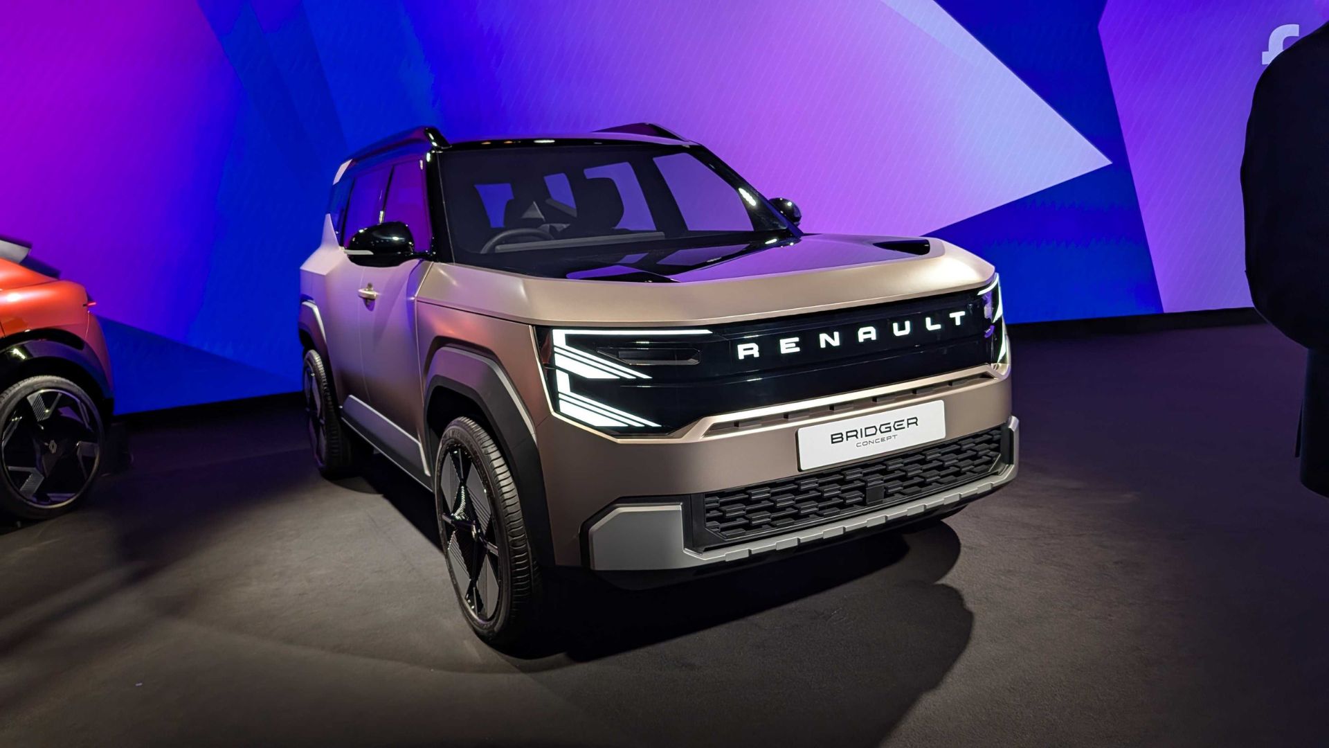 Oubliez les lignes fluides et sages des R5 ou des Megane E-Tech. Le Bridger Concept mise sur un caractère affirmé, symbole de conquête. Avec moins de 4 mètres de long, le SUV affiche une présence plutôt imposante, grâce à une silhouette cubique et sculptée. La signature lumineuse est aussi particulièrement travaillée sur ce modèle et vient renforcer l’assurance du concept.