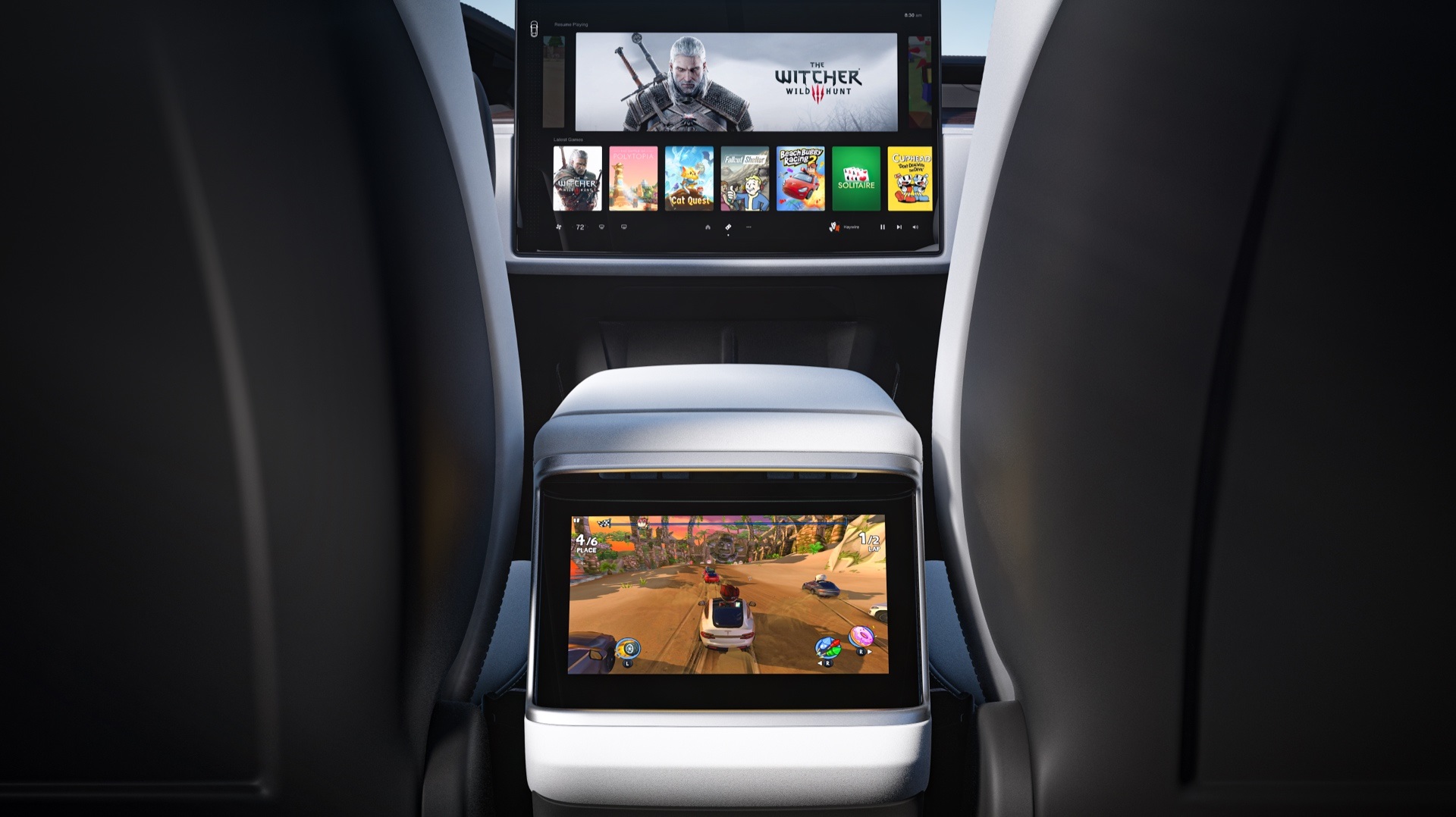 - Trois écrans (un écran central ajustable de 17 pouces, un écran HD derrière le volant et un écran arrière donnant accès au multimédia, aux jeux et aux contrôles de la ventilation) ;