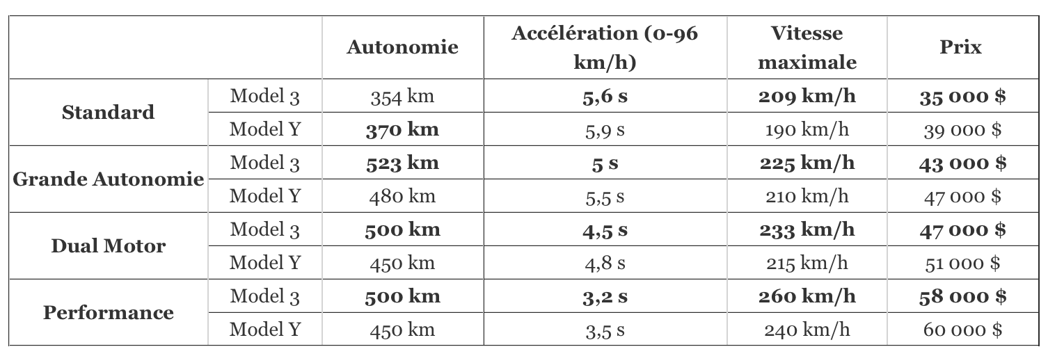 Durant sa conférence, Tesla a annoncé quatre versions pour son Model Y : Standard, Grande Autonomie, Dual Motor et Performance. Dans un premier temps, ce sont les déclinaisons les plus onéreuses qui seront livrées. Du côté de la Model 3, le constructeur commercialise aujourd’hui six versions différentes.