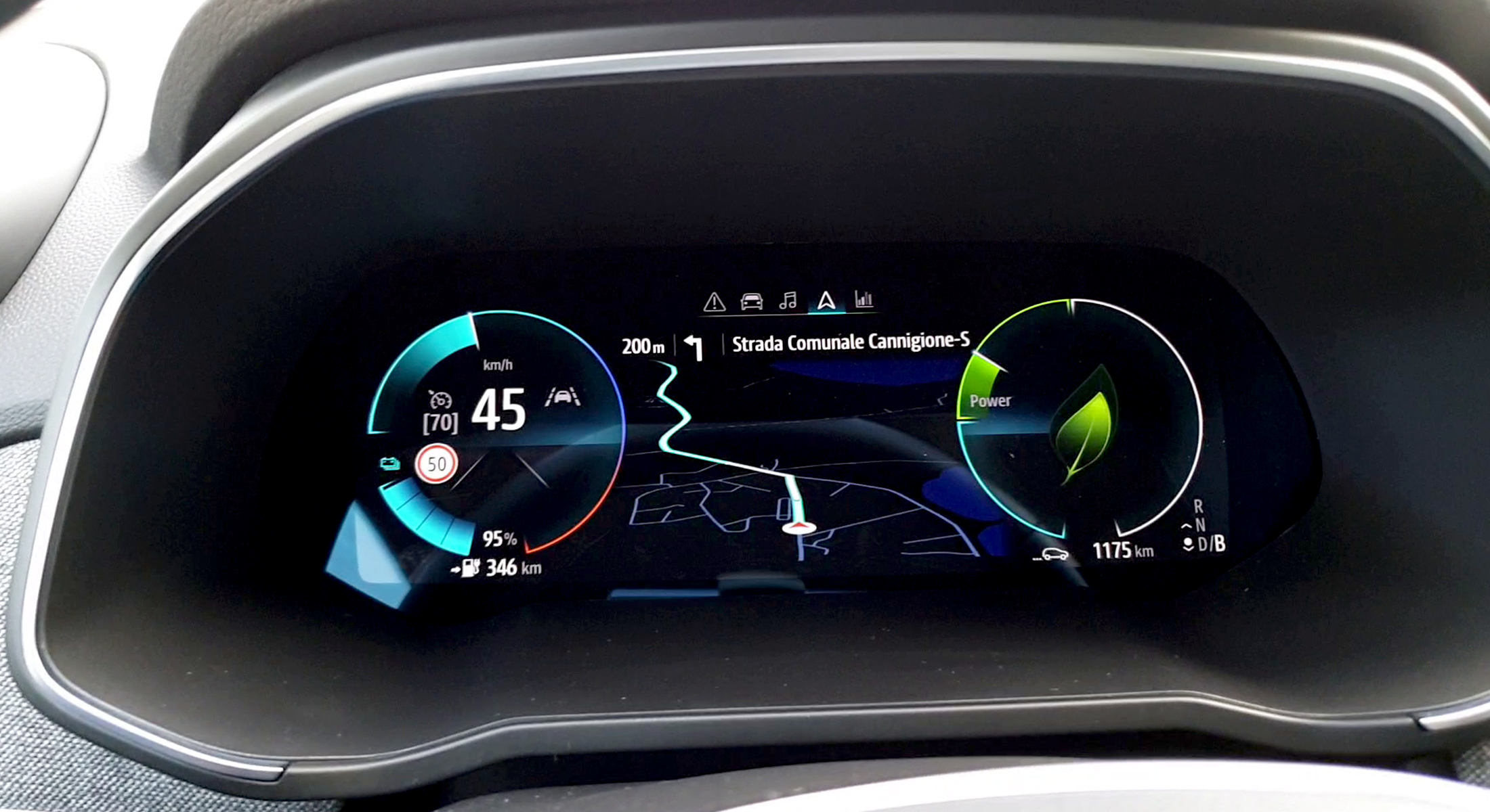 Et le résultat est d’ailleurs de bonne qualité. Même si d’autres informations sont disponibles et peuvent être affichées sur cette partie centrale de l’écran, c’est l’indication que nous avons trouvé la plus agréable et que nous avons le plus utilisée. Et si d’aventure les instructions de navigation de sont pas utiles, il est tout à fait possible de privilégier les informations détaillées de la consommation.