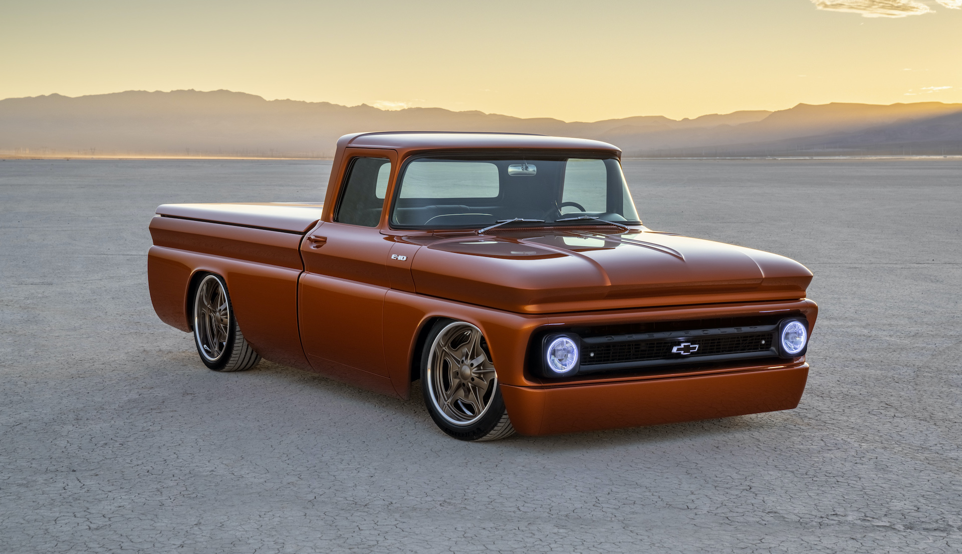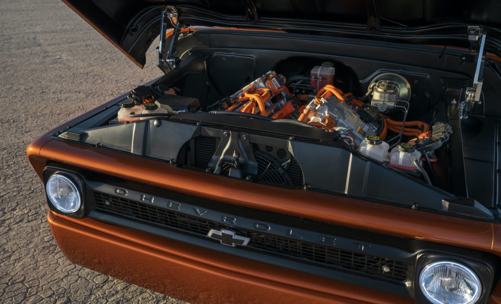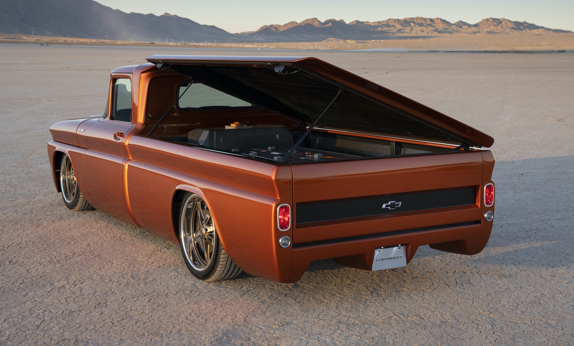 En tout, c’est l’équivalent de 450 chevaux de puissance qui sont envoyés vers les roues situées à l’arrière (pas de transmission intégrale). Le 0 à 96 km/h est avalé en cinq secondes environ, ce qui est plutôt impressionnant pour un véhicule dont le look est repris du pickup C-10 de 1962. On notera quand même l’affaissement prononcé et le logo lumineux à l’avant.