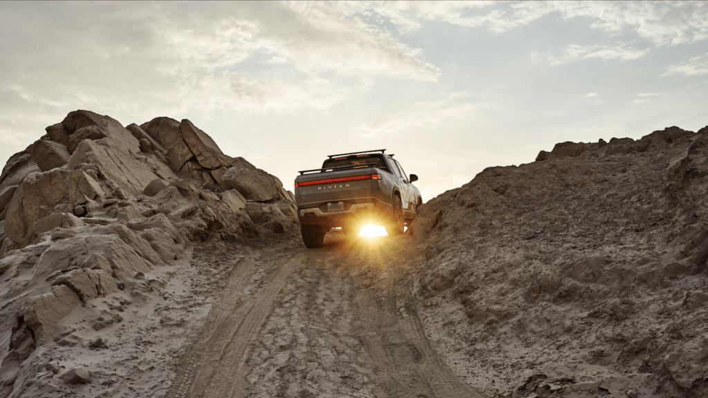 Outre l’effet cartes postales, Rivian profite de ces paysages pour tester les performances de son R1T en hors piste — dans des conditions parfois complexes (exemple : des dunes de sable). À croire que le pickup est taillé pour le rallye Dakar…