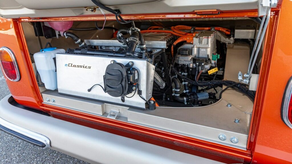 À défaut d’une autonomie confortable, eClassics promet une expérience de conduite inédite. Outre la motorisation électrique, le e-Bulli dispose d’un châssis repensé et offre un comportement plus dynamique, dixit la firme. « Le passé glorieux et unique du Bulli se combine à la modernité d’un véhicule électrique », ajoute-t-elle. Les éléments affairant à l’électrification — groupe propulseur, batterie — sont certifiés Volkswagen.